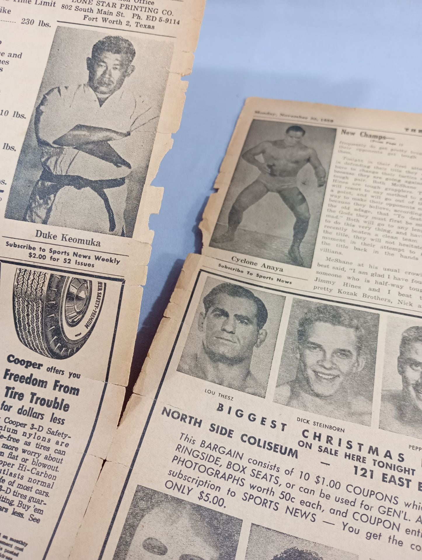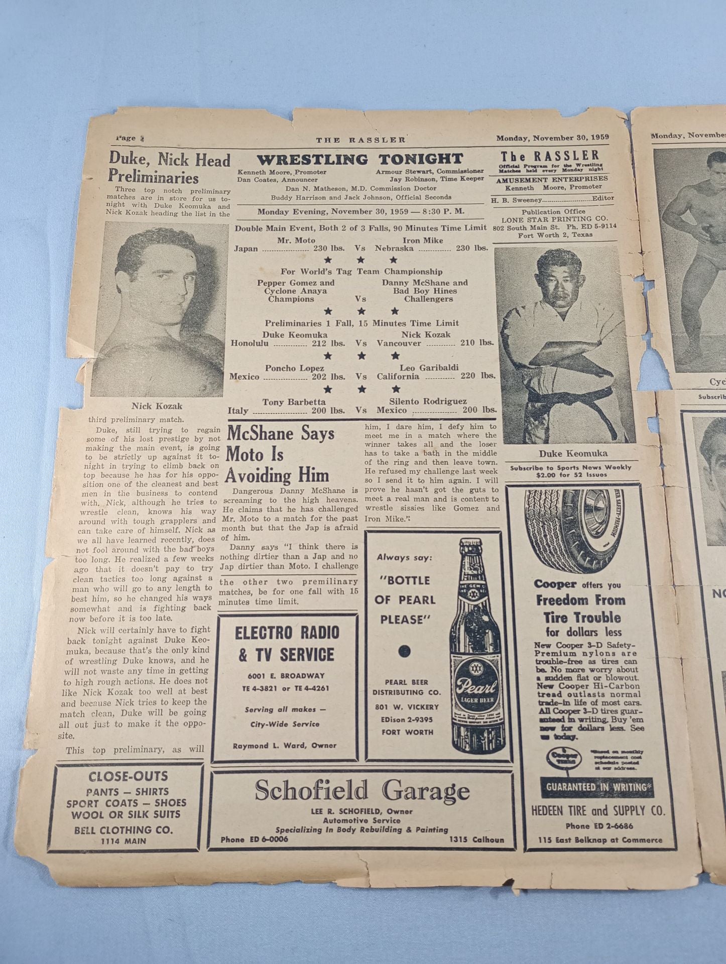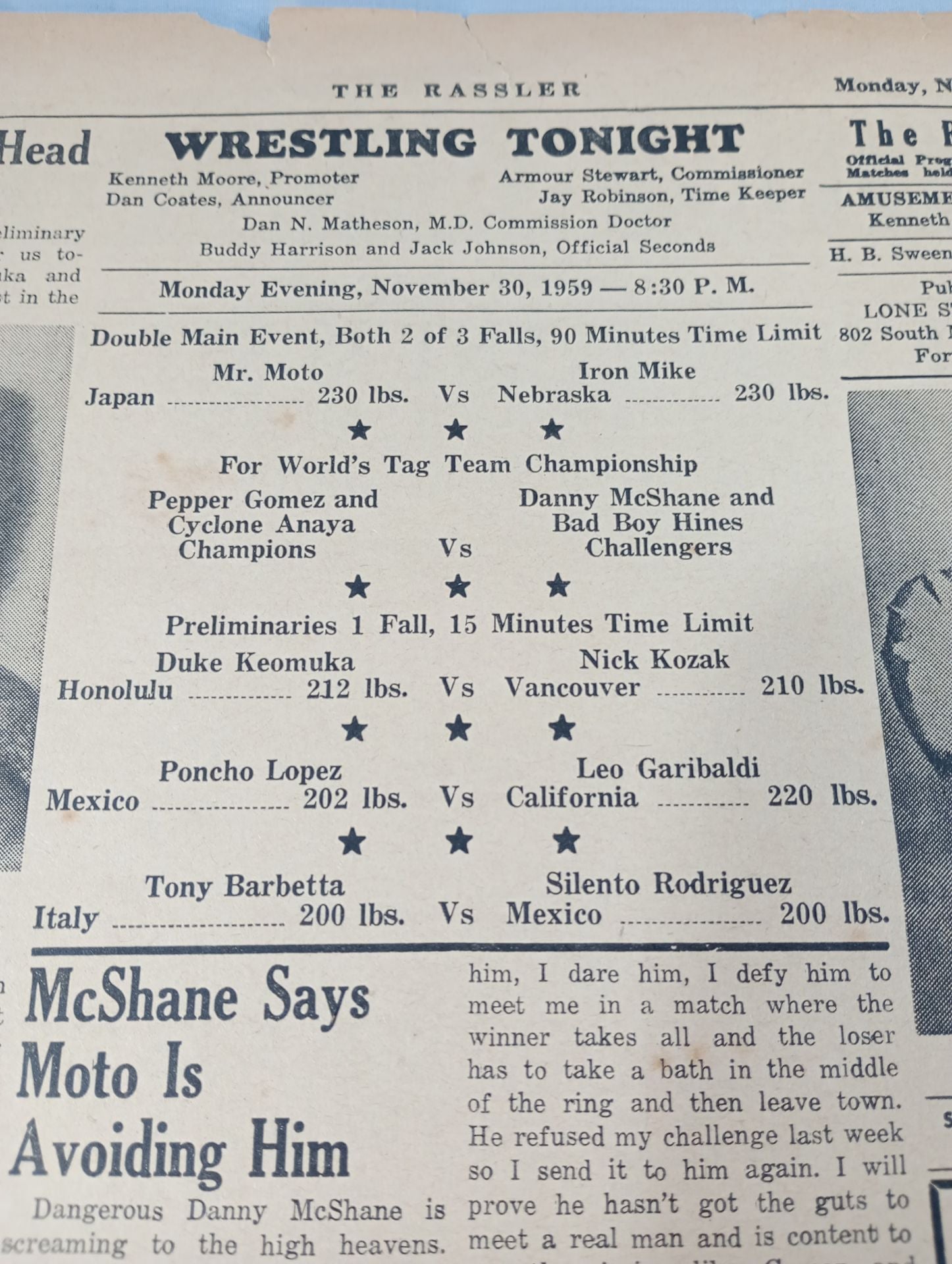 1959年 会場:アメリカ / 全編英語表記印刷対戦カード:【NWA世界タッグ選手権試合(テキサス東部版)】ペッパー・ゴメス&サイクロン・アナヤvsダニー・マクシャイン&バッド・ボーイ・ヒーンズ