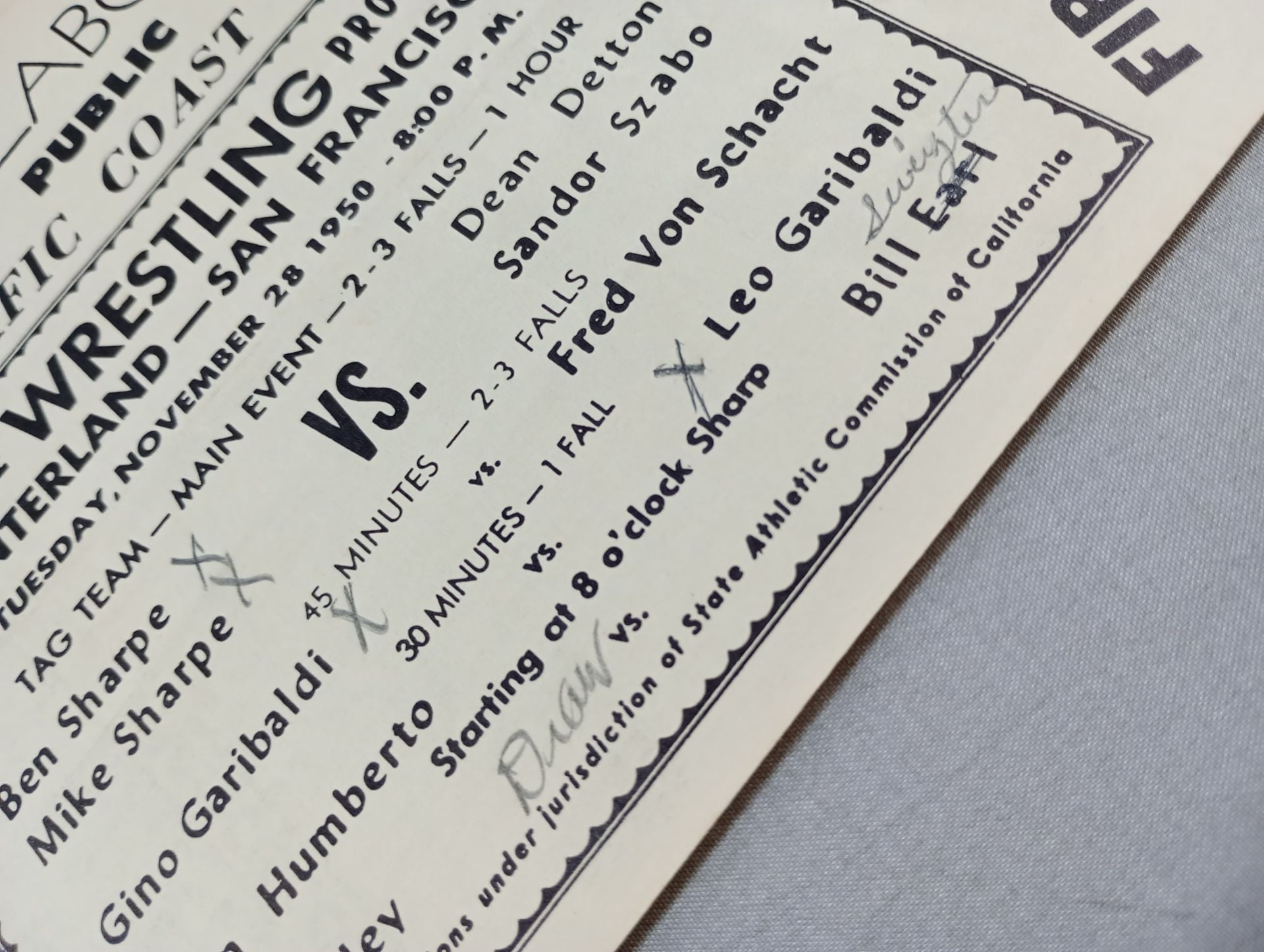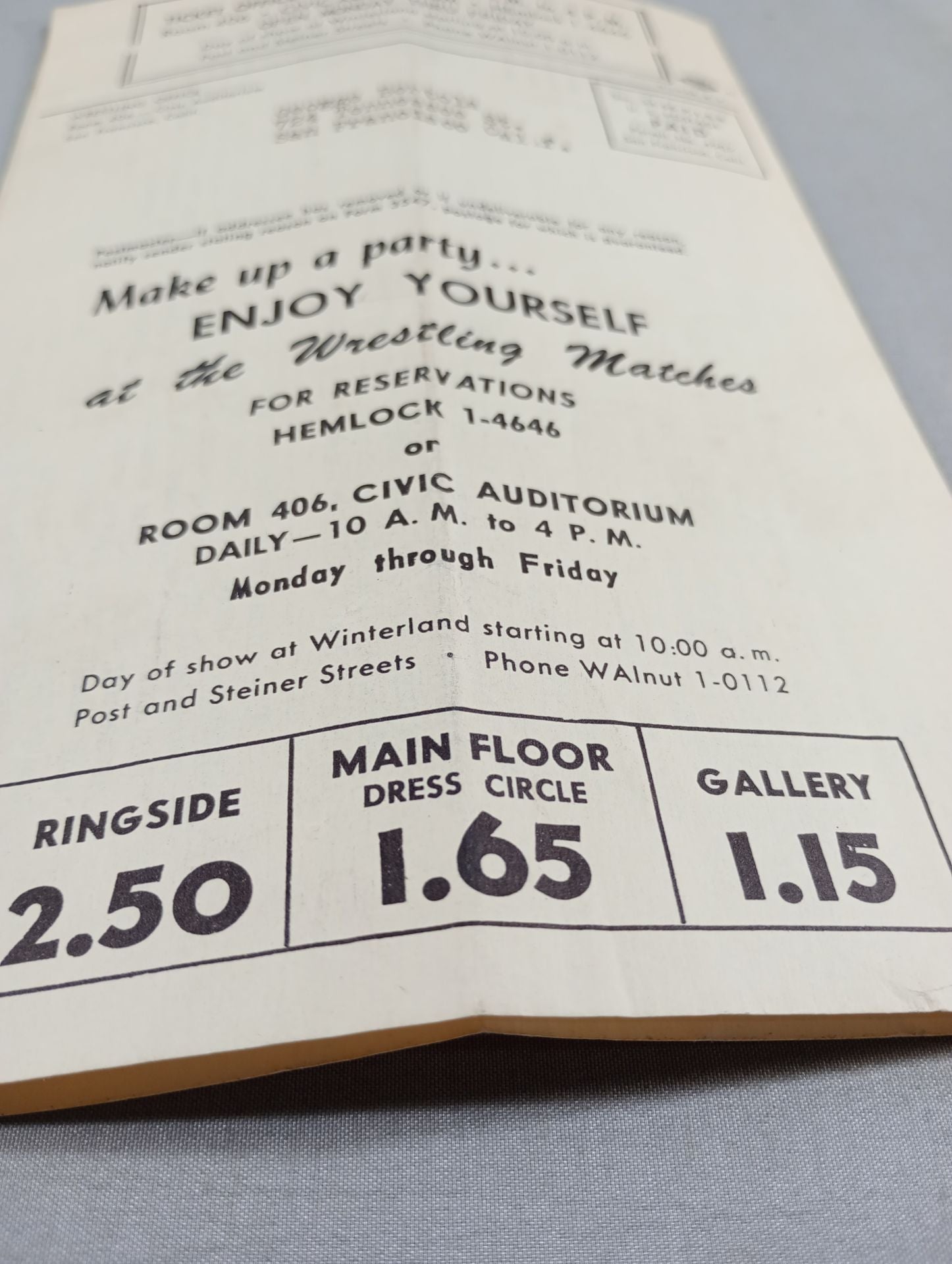 1950年 会場:米 カリフォルニア州サンフランシスコ ウィンターランド / 全編英語表記印刷対戦カード:ベン・シャープ&マイク・シャープvsディーン・デットン&サンダー・ザボー Coliseum