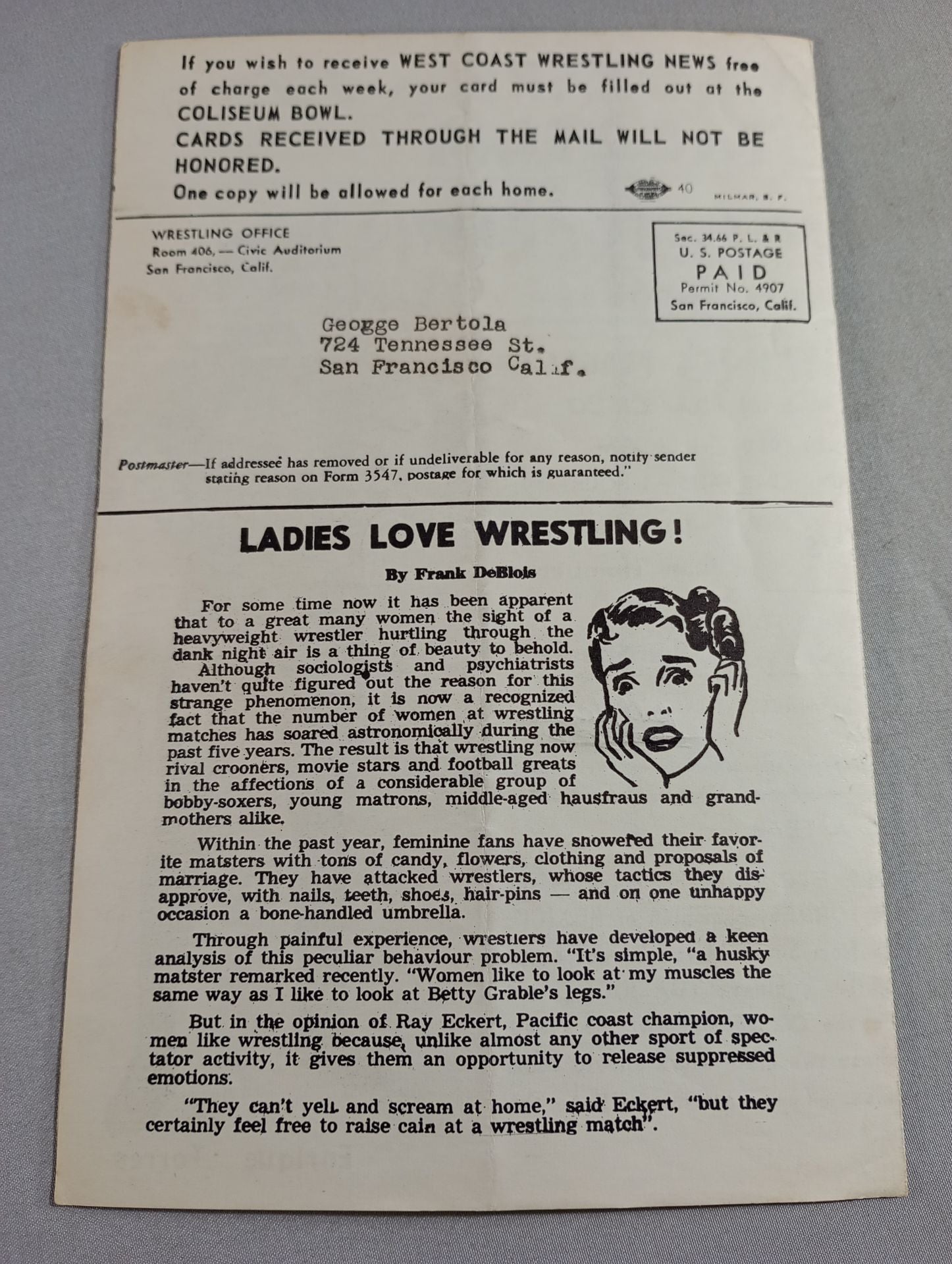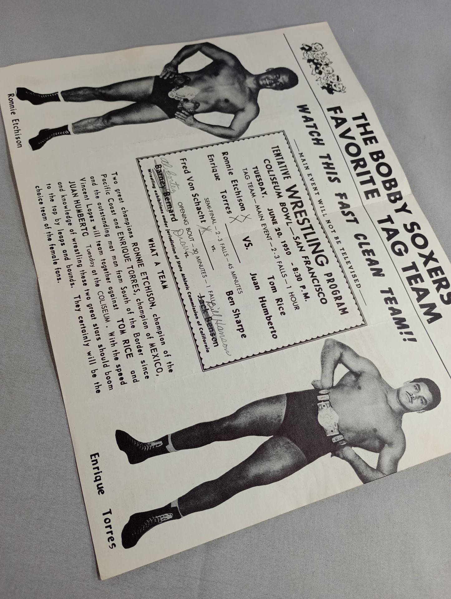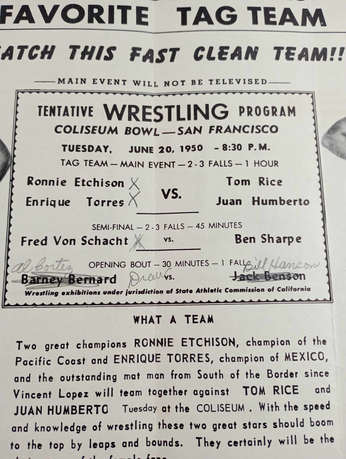 1950年 会場:米 カリフォルニア州サンフランシスコ コロシアム・ボウル / 全編英語表記印刷対戦カード:ロニー・エチソン&エンリケ・トーレスvsタム・ライス&ファン・ウンベルト Coliseum