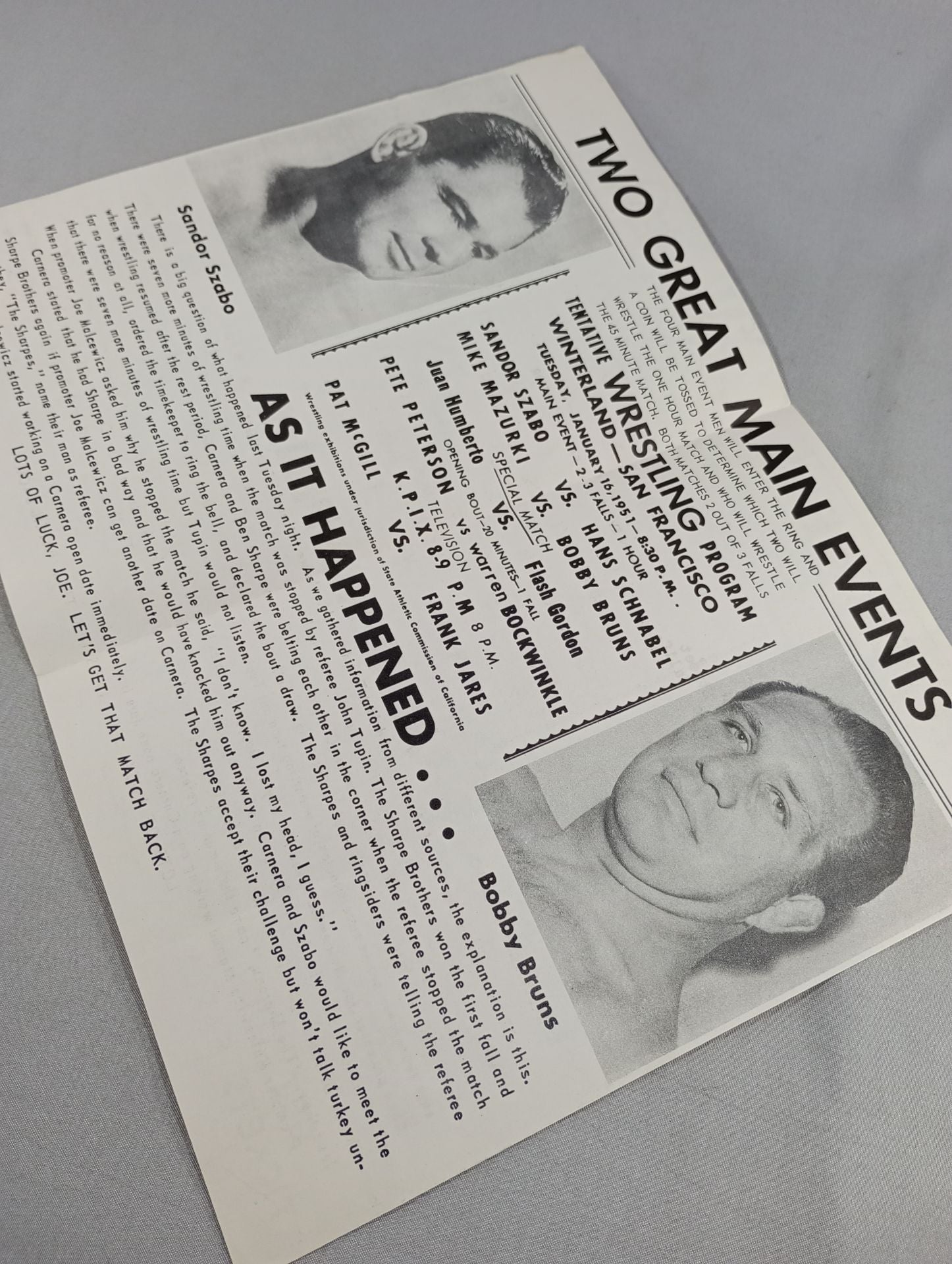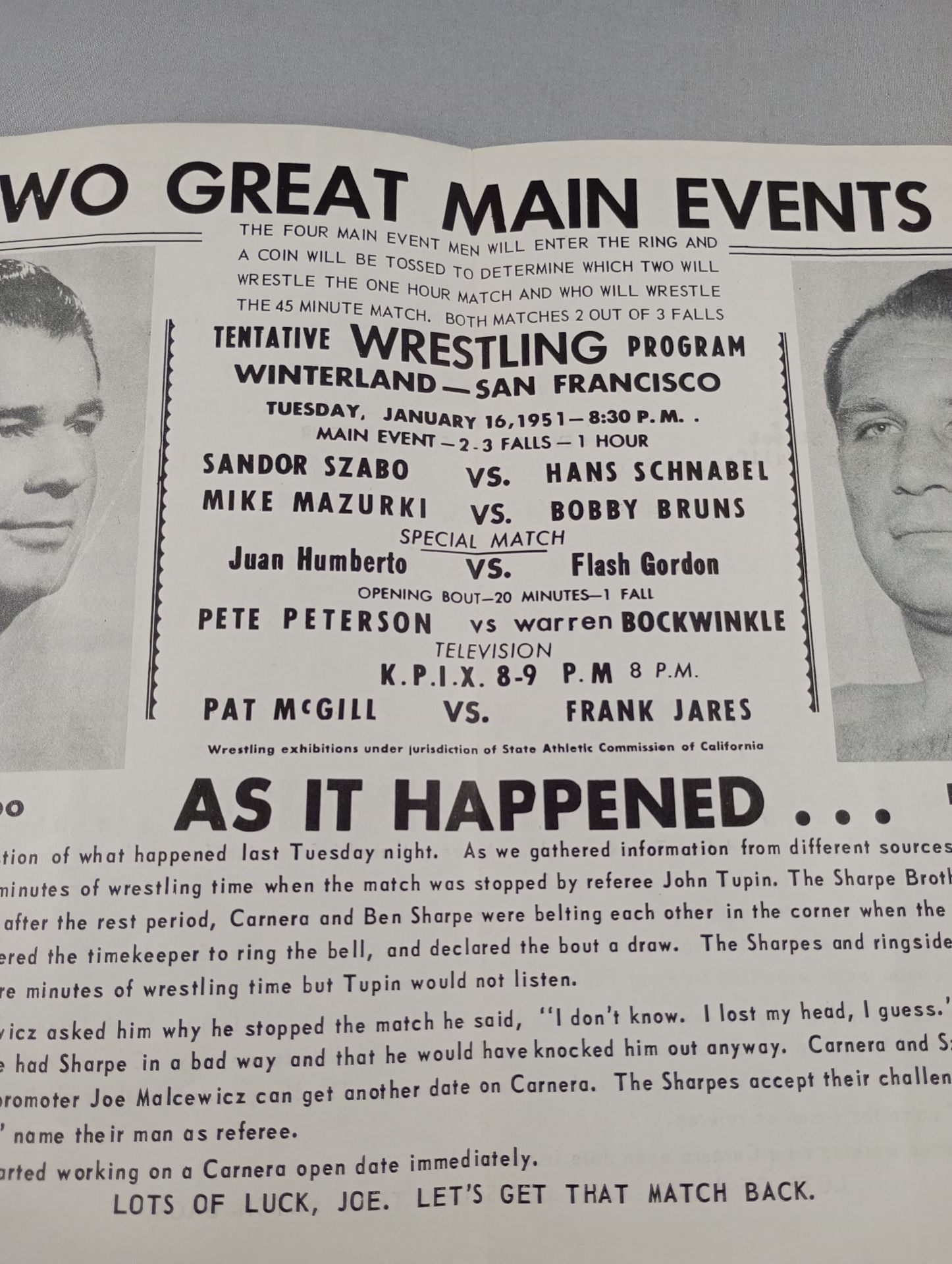 1951年 会場:米 カリフォルニア州サンフランシスコ ウィンターランド / 全編英語表記印刷対戦カード:サンダー・ザボーvsハンス・シュナーベル Coliseum