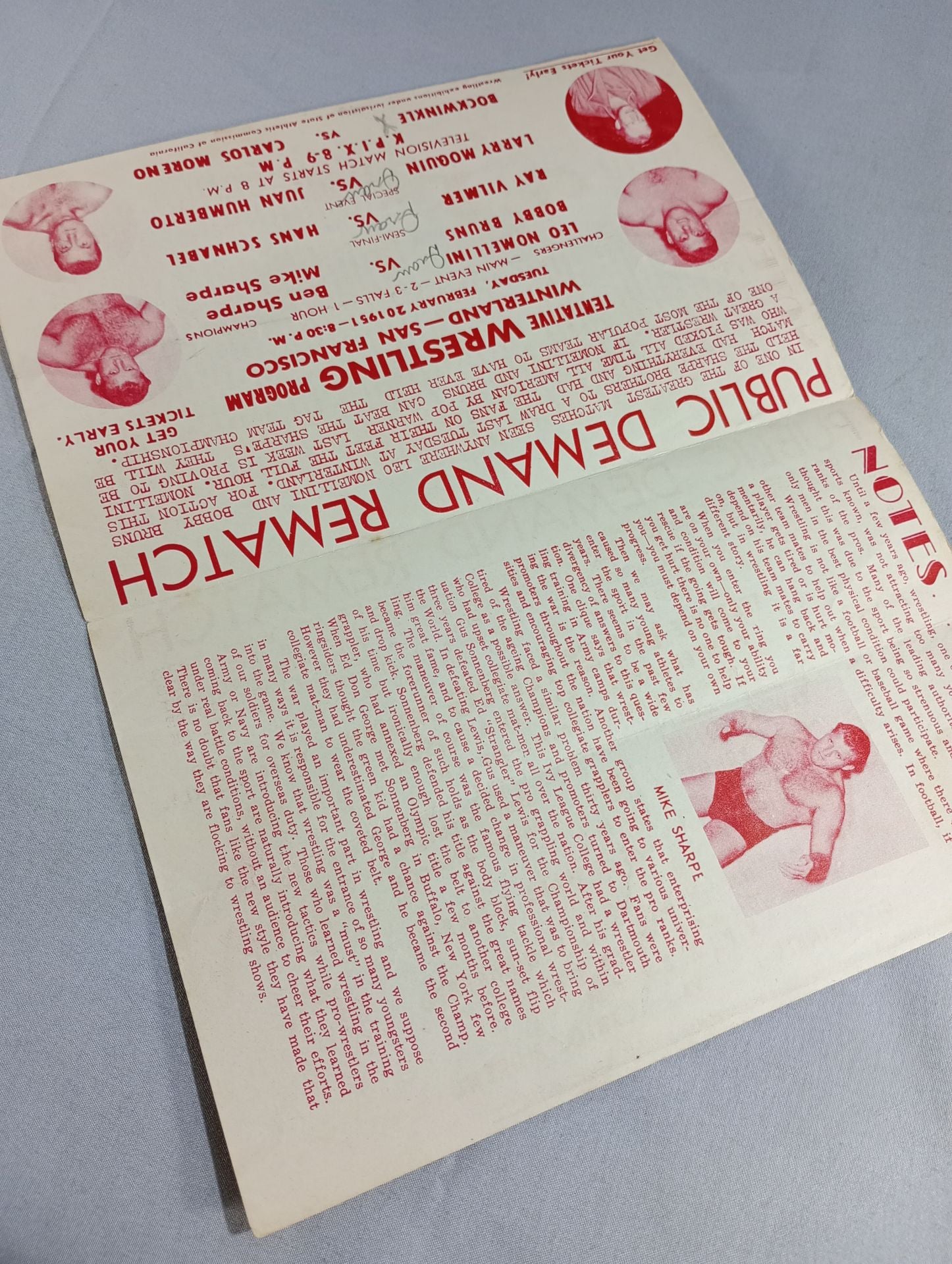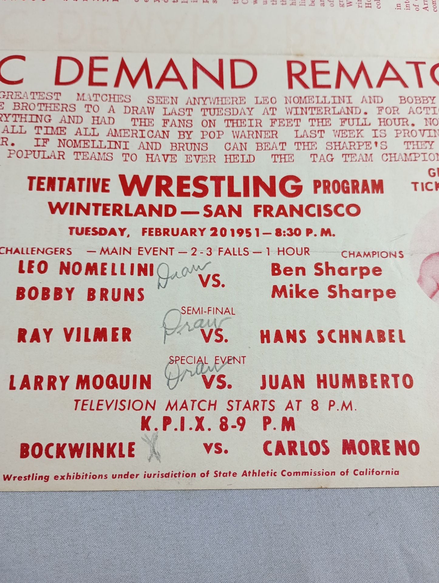 1951年 会場:米 カリフォルニア州サンフランシスコ ウインターランド / 全編英語表記印刷対戦カード:レオ・ノメリーニ&ボビー・ブランズvsベン・シャープ&マイク・シャープ Coliseum
