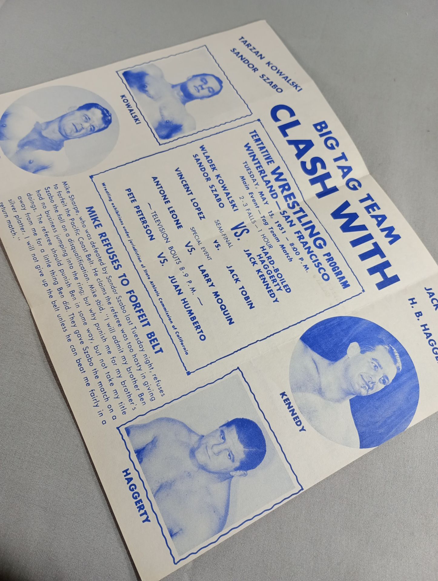 1951年 会場:米 カリフォルニア州サンフランシスコ ウィンターランド / 全編英語表記印刷対戦カード:ウラデック・コワルスキー(キラー・コワルスキー)&サンダー・ザボーvsハードボイルド・ハガティ&ジャック・ケネディ Coliseum