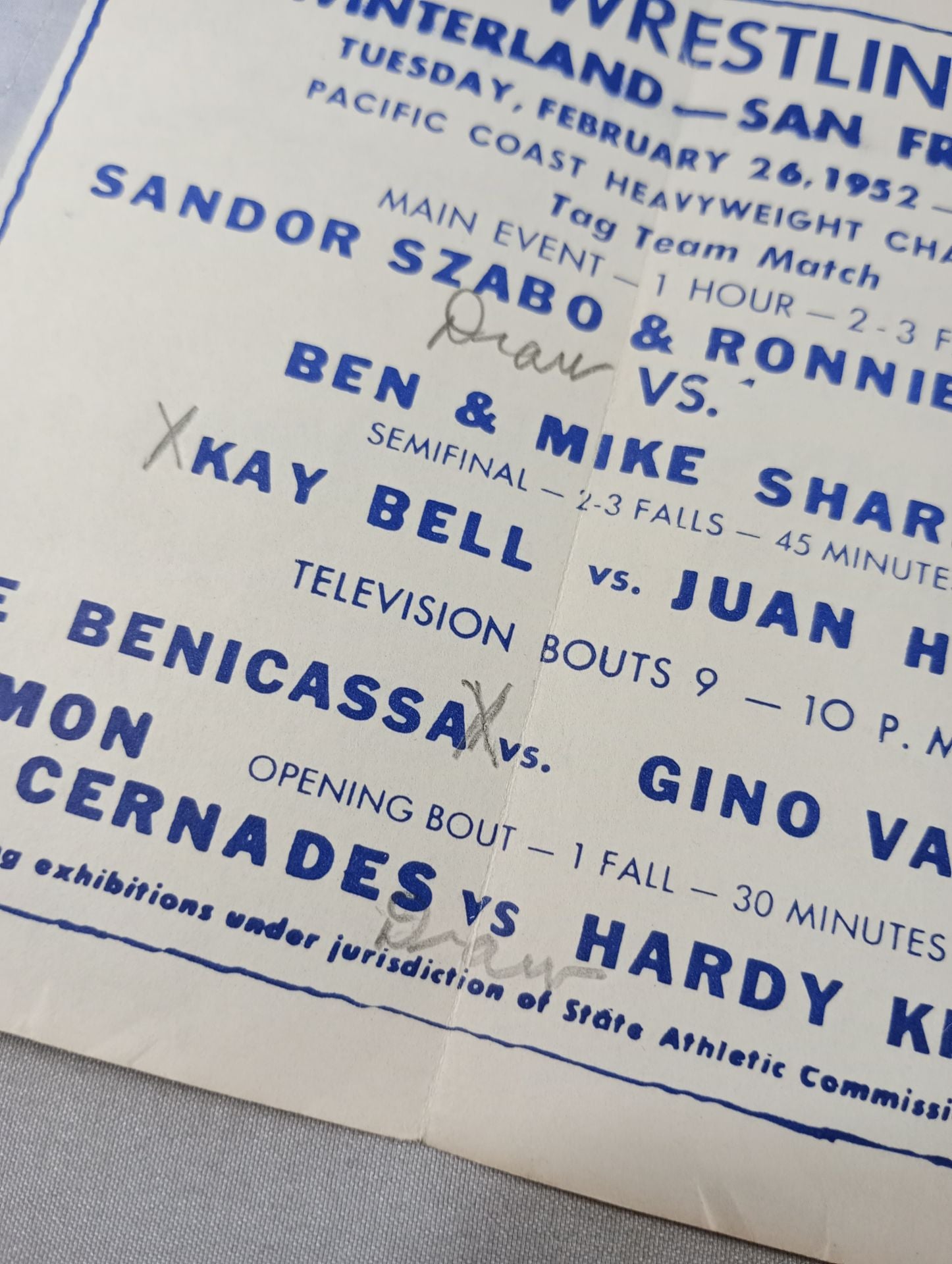 1952年 会場:米 カリフォルニア州サンフランシスコ ウィンターランド / 全編英語表記印刷対戦カード:サンダー・ザボー&ロニー・エチソンvsベン・シャープ&マイク・シャープ Coliseum