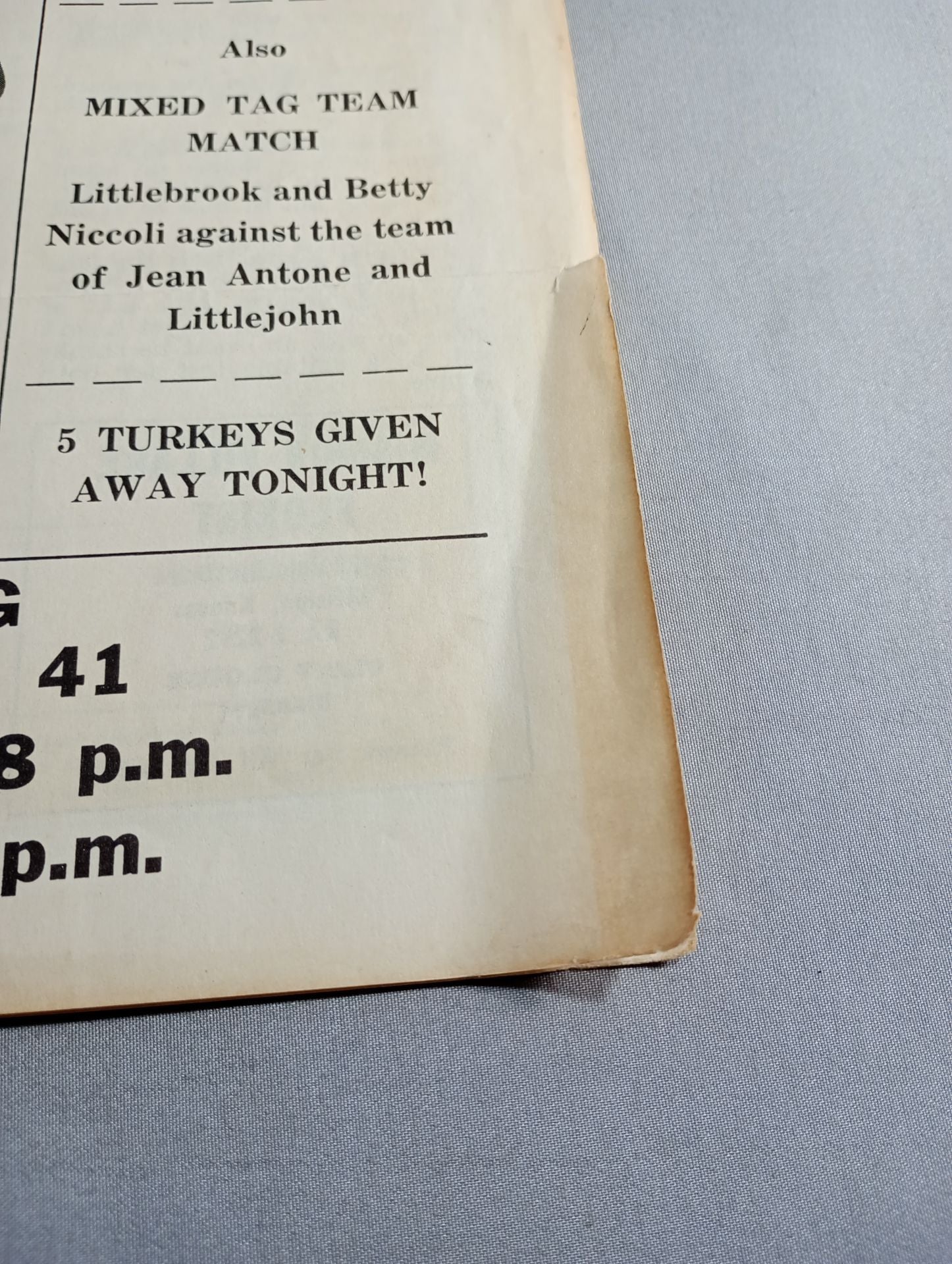 1974年 会場:米 カンザス州カンザスシティ メモリアルホール / 全編英語表記印刷対戦カード:【NWA世界タッグ選手権試合(セントラルステーツ版)】マイク・ジョージ&ジェリー・オーツvsブルドッグ・ボブ・ブラウン&ロード・アルフレッド・ヘイズ