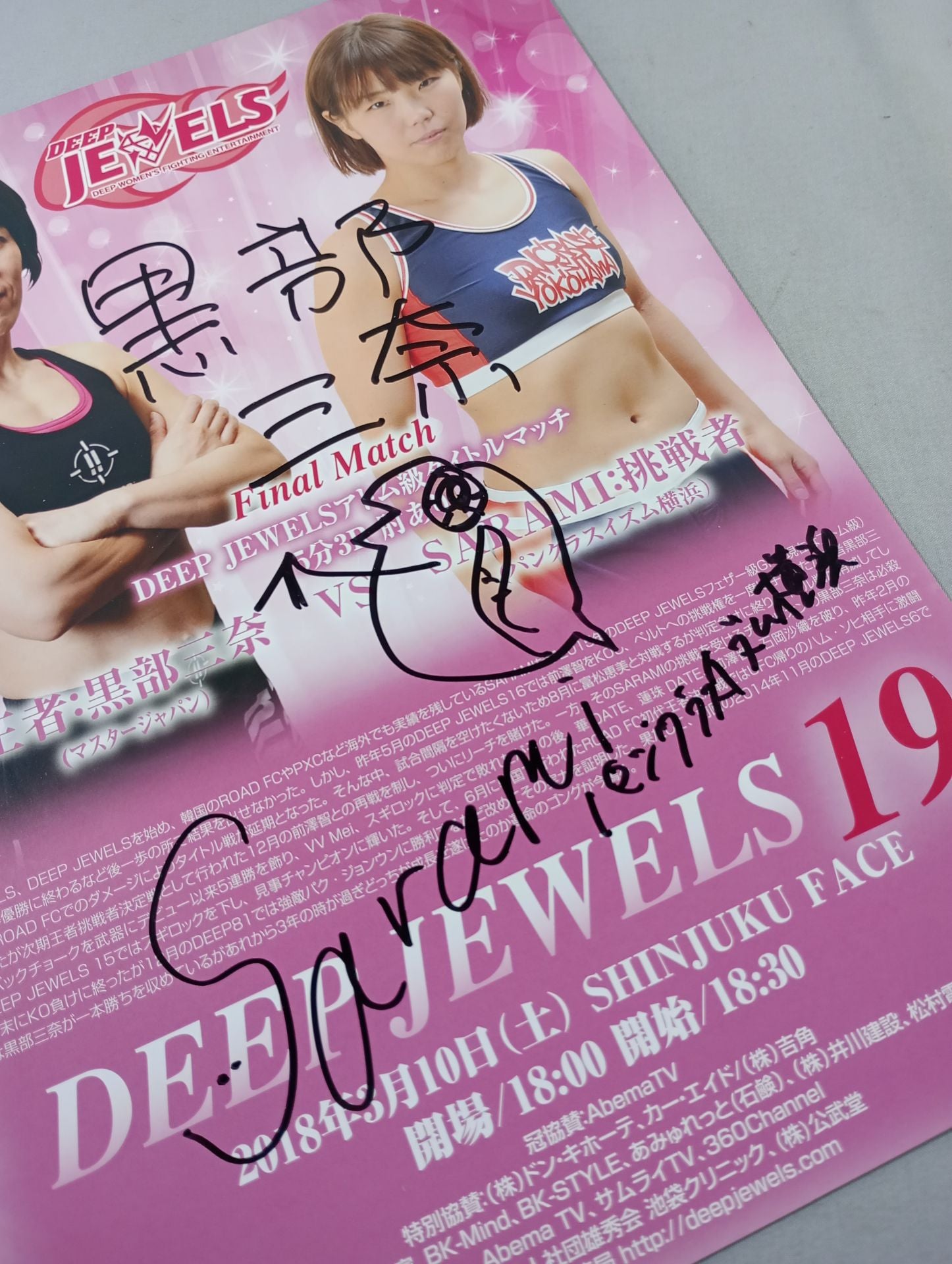 2018年 黒部三奈、SARAMI 以上 2選手直筆サイン入り!会場:新宿FACE / 印刷対戦カード:【DEEP JEWELSアトム級タイトルマッチ】黒部三奈vsSARAMI