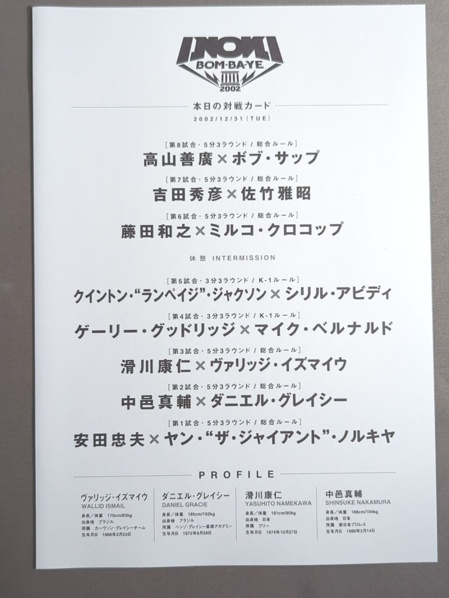 2002年 会場:さいたまスーパーアリーナ / 別紙対戦カードあり:高山善廣vsボブ・サップ / 吉田秀彦vs佐竹雅昭 / 藤田和之vsミルコ・クロコップ / 中邑真輔vsダニエル・グレイシー