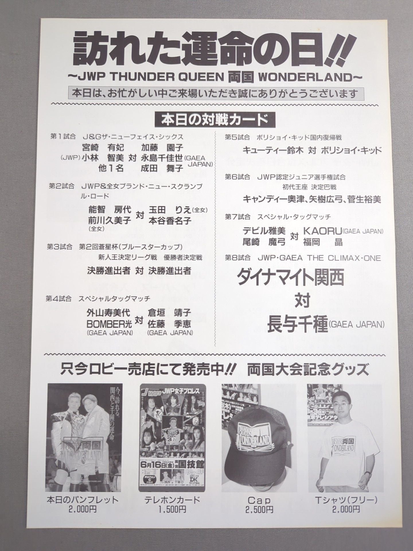 会場:両国国技館 / 別紙対戦カードあり:ダイナマイト関西VS長与千種 / デビル雅美&尾崎魔弓vsKAORU&福岡晶 / 【JWP認定ジュニア選手権試合・初代王座決定巴戦】キャンディー奥津vs矢樹広弓vs菅生裕美