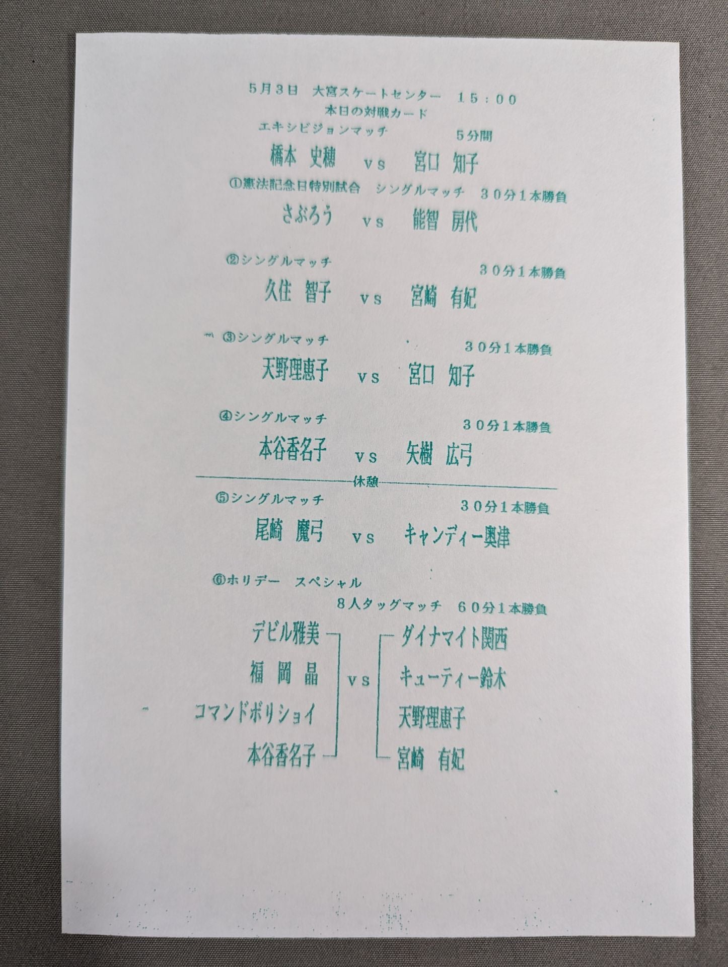 会場:埼玉・大宮スケートセンター / 別紙対戦カードあり:デビル雅美&福岡晶&コマンドボリショイ&本谷香名子vsダイナマイト関西&キューティー鈴木&天野理恵子&宮崎有妃