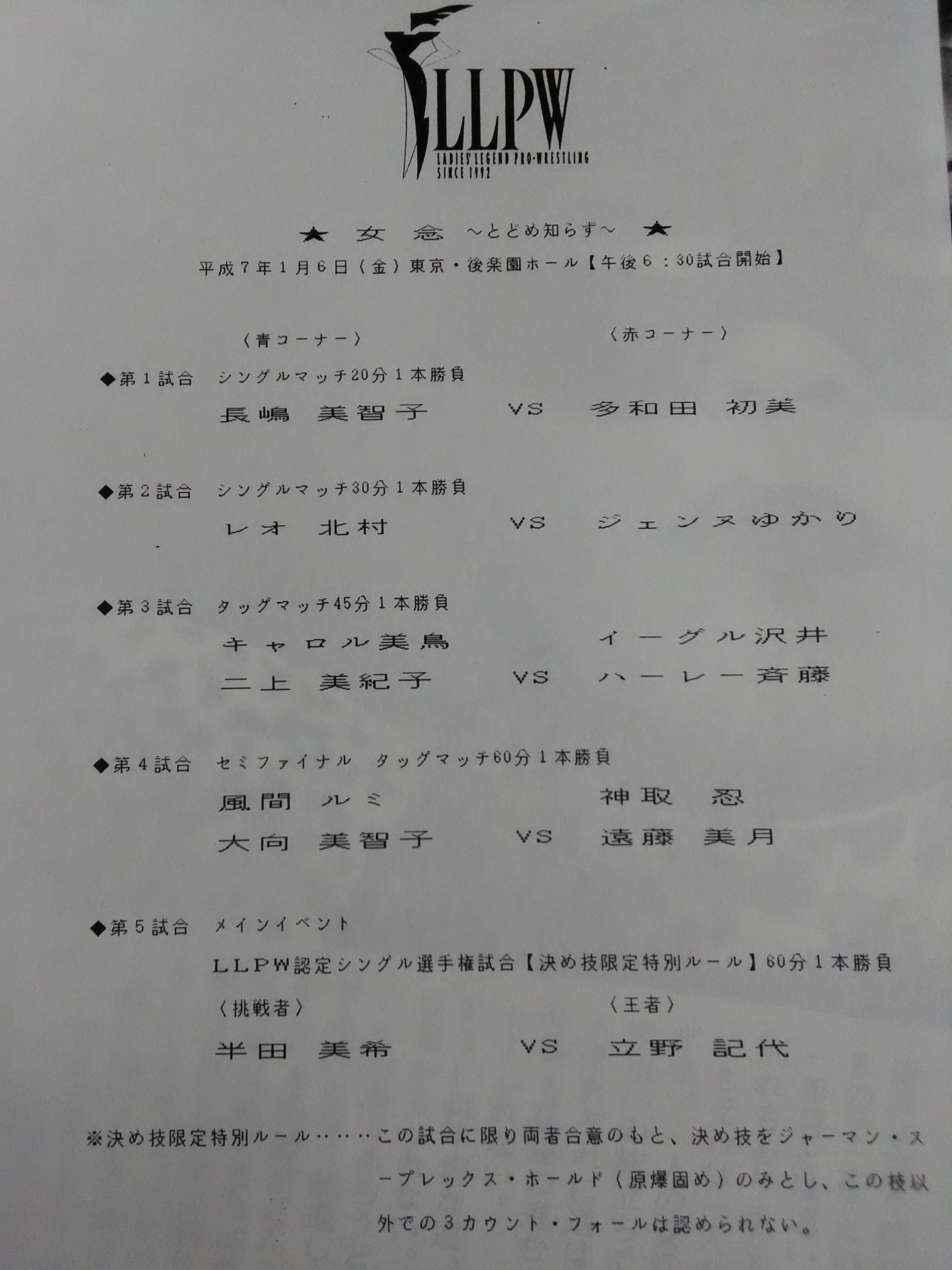 会場:後楽園ホール / 別紙対戦カードあり:【LLPW認定シングル選手権】半田美希vs立野記代