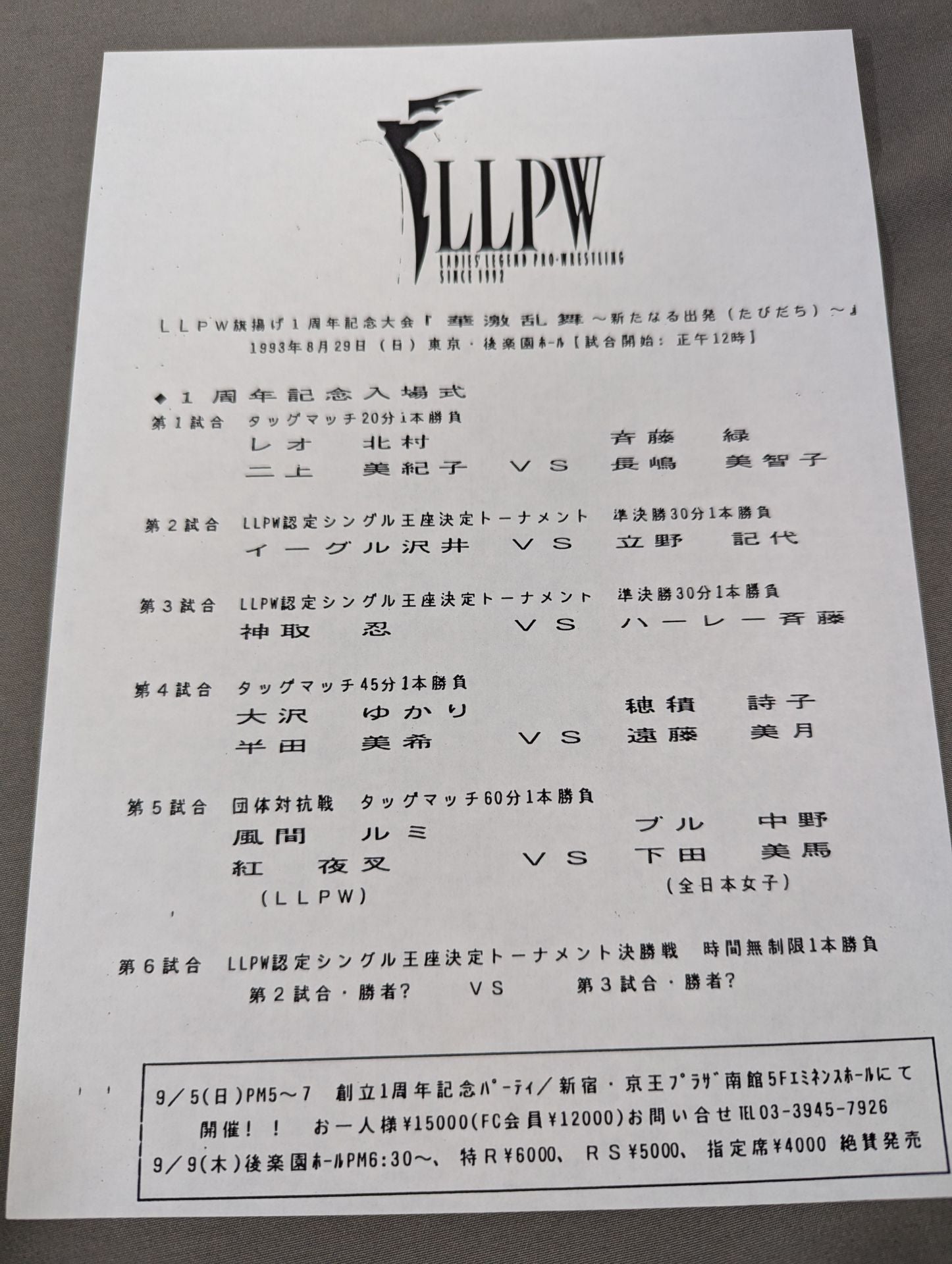 会場:後楽園ホール / 別紙対戦カードあり:【LLPW認定シングル王座決定トーナメント 決勝戦】第2試合勝者vs第3試合勝者(神取忍vsイーグル沢井) / 風間ルミ&紅夜叉vsブル中野&下田美馬