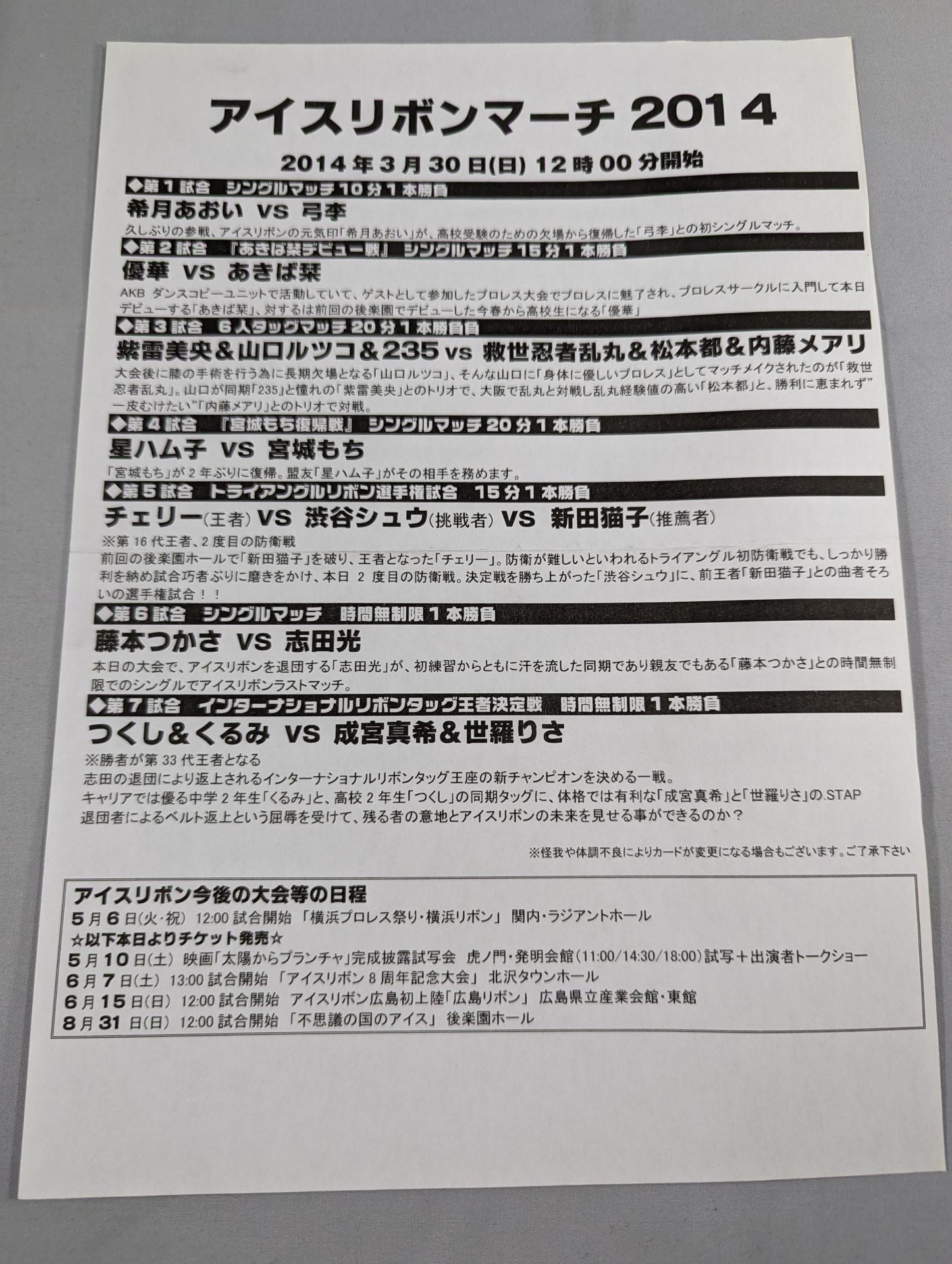 会場:後楽園ホール / 別紙対戦カードあり:【インターナショナルリボンタッグ王者決定戦】つくし&くるみvs成宮真希&世羅りさ / 藤本つかさvs志田光 / アイスリボンマーチ2014 BE HAPPY WITH PRO WRESTLING