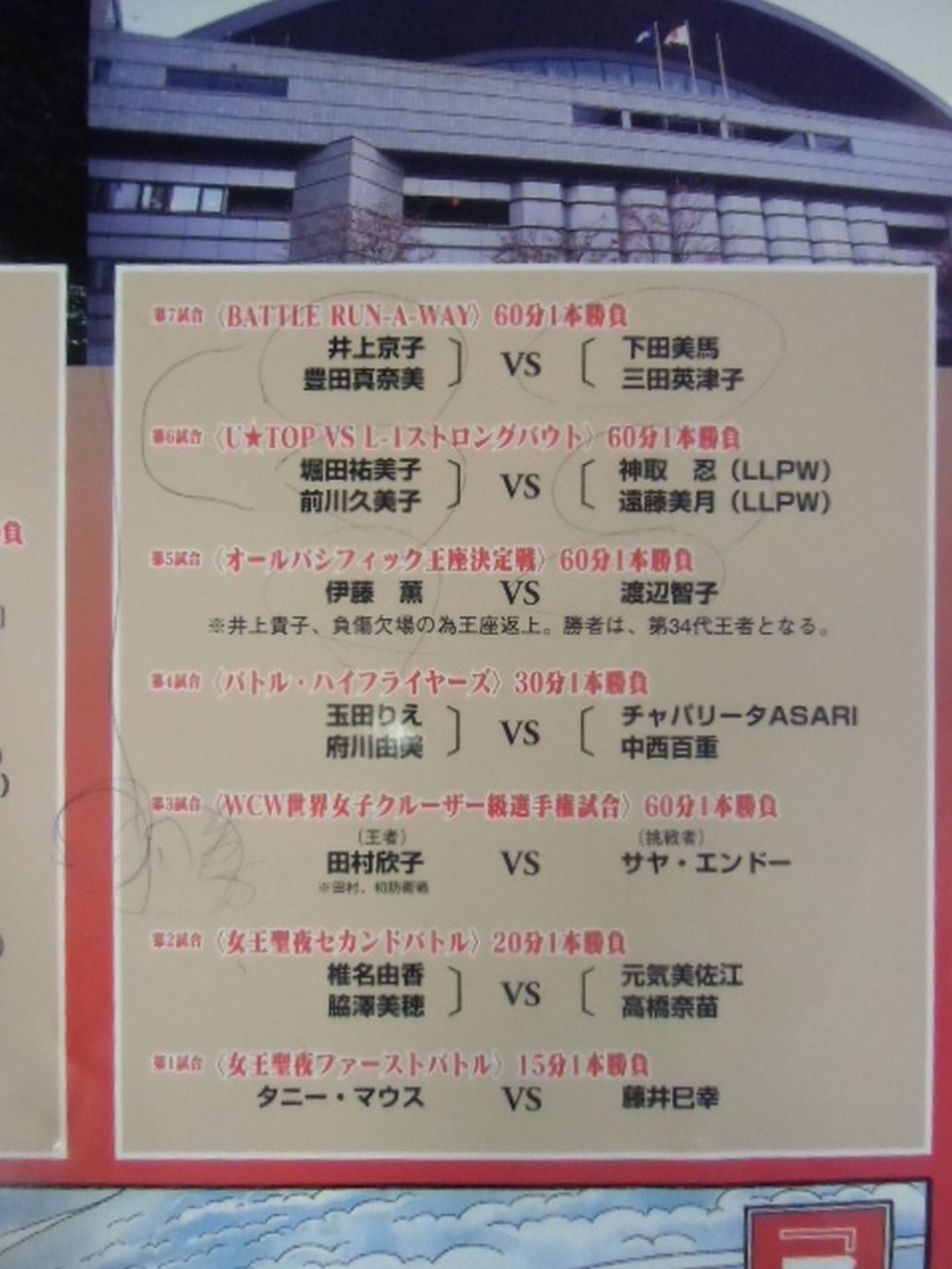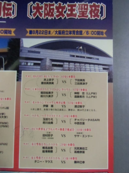 印刷対戦カード2大会分表記あり:(8.20 日本武道館)【WWWA世界タッグ戦選手権試合】下田美馬&三田英津子vs渡辺智子&前川久美子 / (8.22 大阪府立体育会館) 井上京子&豊田真奈美vs下田美馬&三田英津子