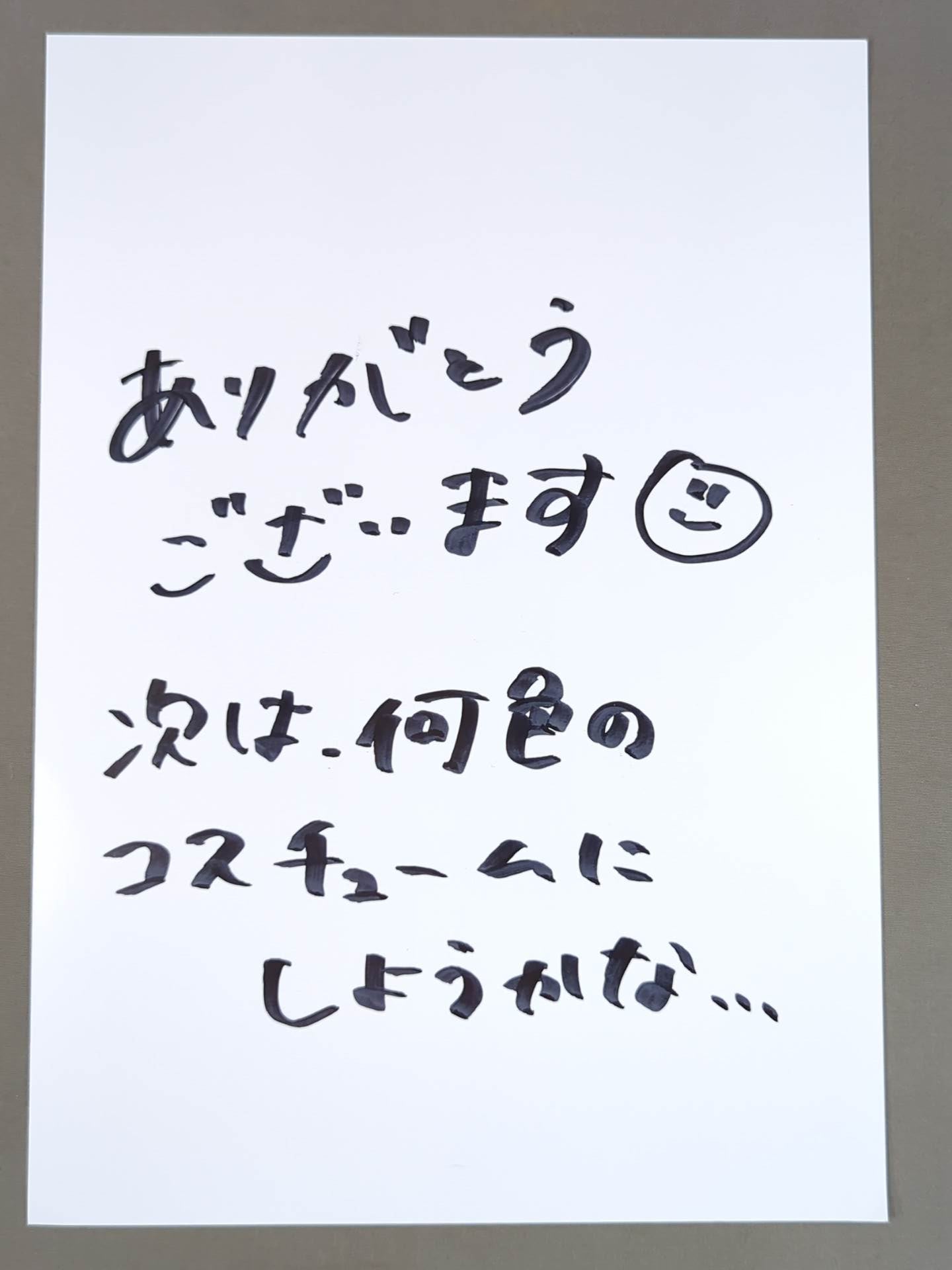 状態詳細 | 裏にメッセージ「ありがとうございます。次は何色のコスチュームにしようかな...」 |