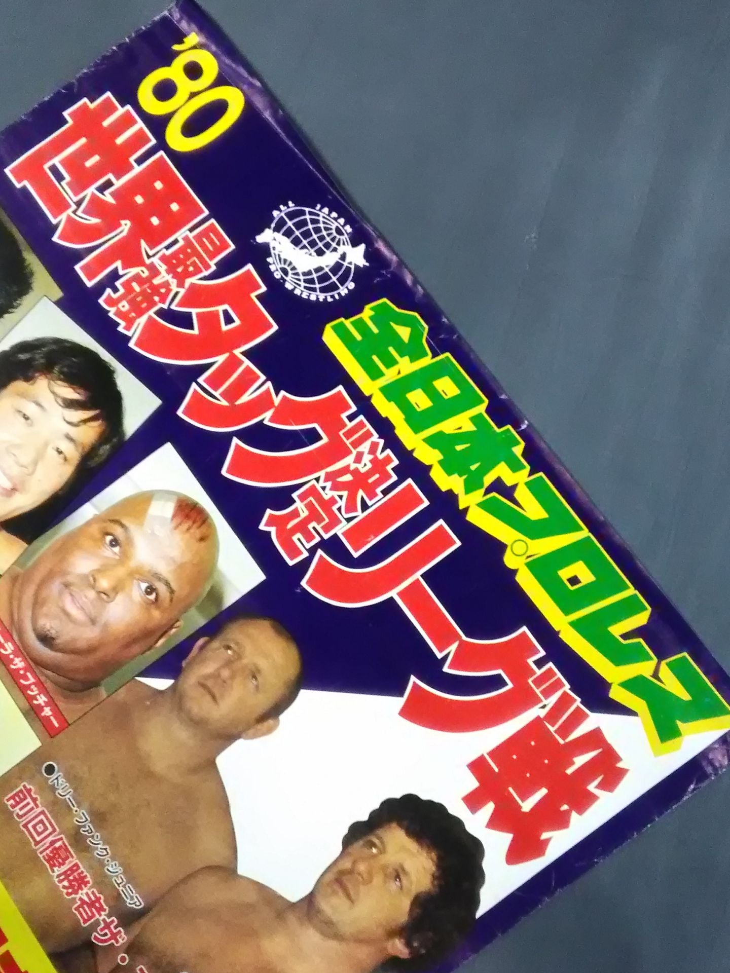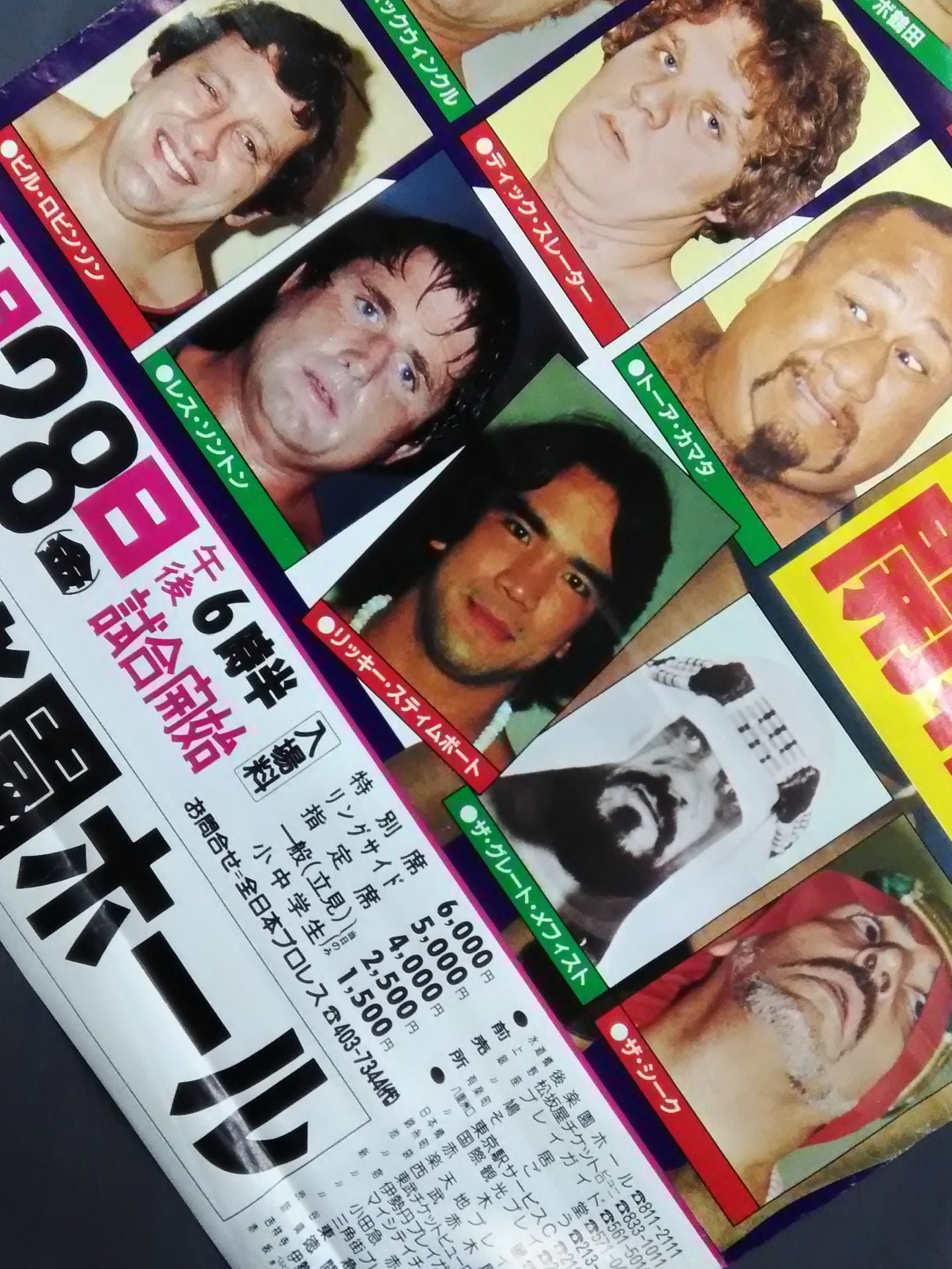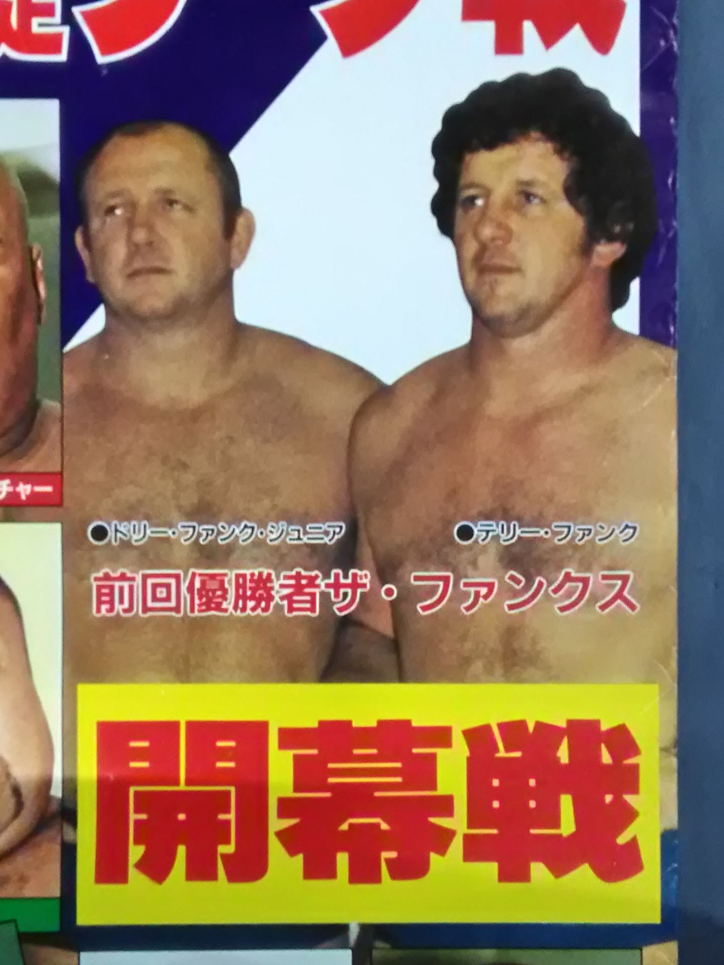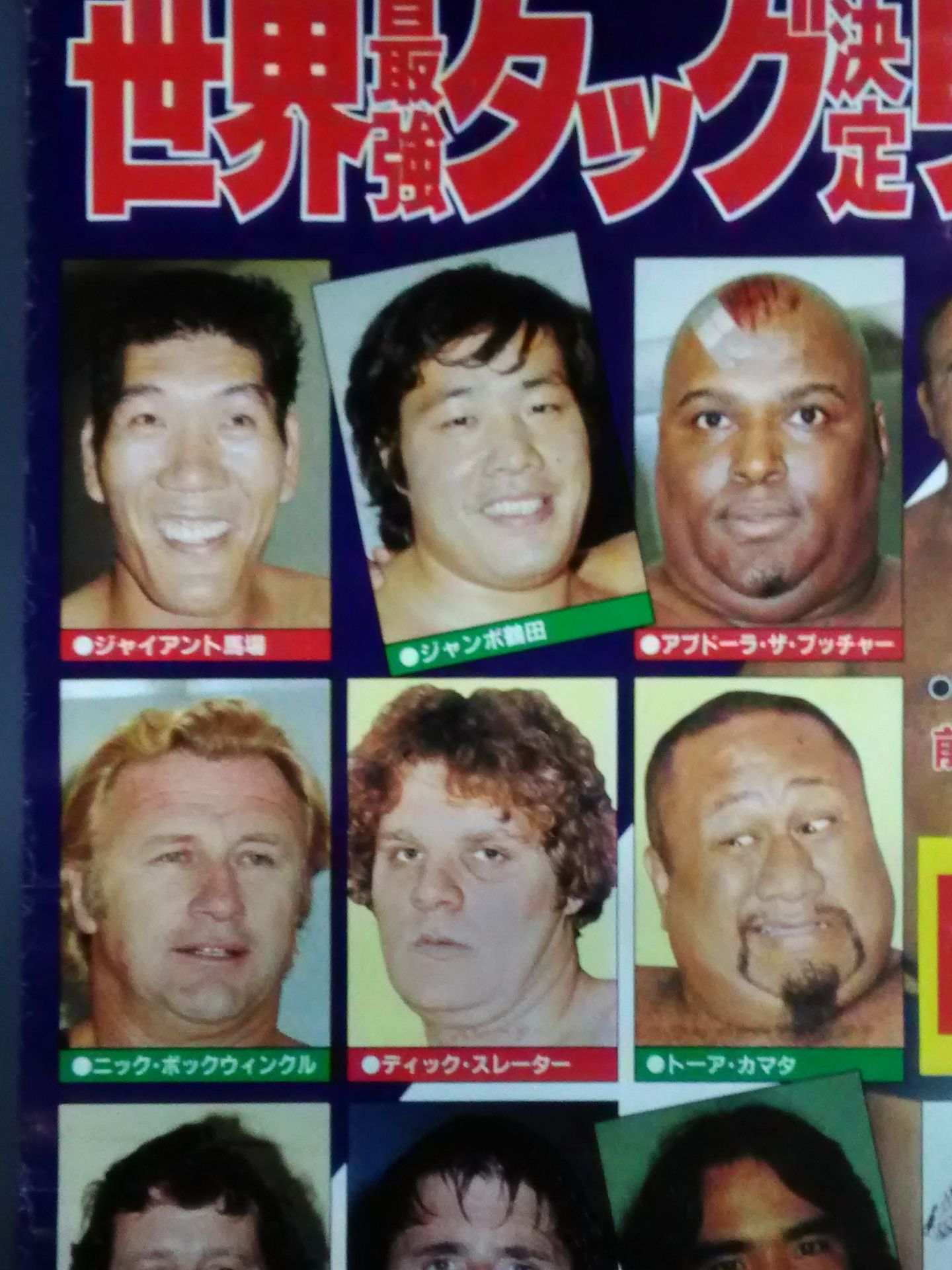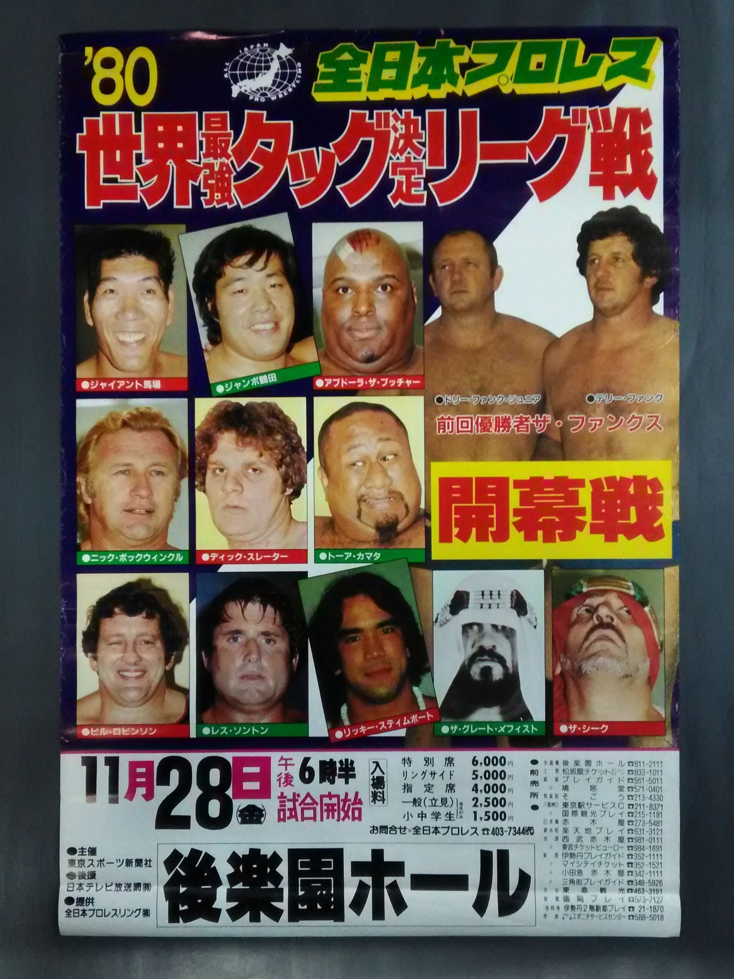 【タッグ・リーグ戦】アブドーラ・ザ・ブッチャー&キラー・トーア・カマタvsディック・スレーター&リッキー・スティムボート、テリー・ファンク&ドリー・ファンク・ジュニアvsザ・シーク&ザ・グレート・メフィスト / ビル・ロビンソン&レス・ソントンvsジャイアント馬場vsプリンス・トンガ / これまでタッグを組んでいたブッチャーとシークだが、昨年の決勝戦でザ・ファンクスとの試合中に仲間割れ、今シリーズではそれぞれのチームで参戦することとなった。カマタとタッグを組んだブッチャーはスレーター&スティムボート組と対戦し、反則勝ちにより勝利した。シークはメフィストとタッグを組みザ・ファンクスと対戦。場外戦となりシークとテリーがやりあう間にドリーがメフィストをパンチで倒しリングに帰還、ザ・ファンクスが勝利した。 / サイズ(76cm×52cm)