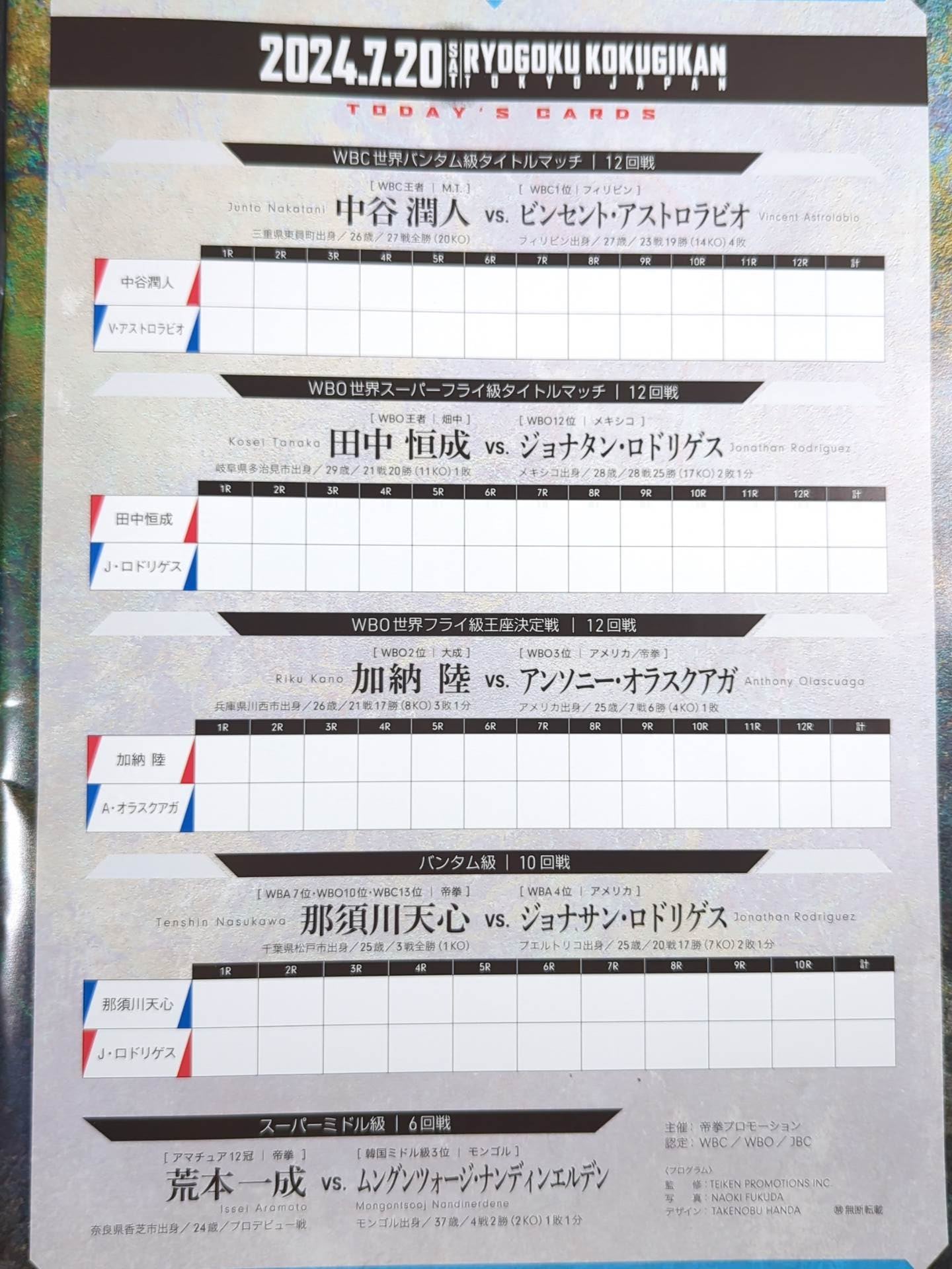 会場:両国国技館 / 印刷対戦カード:【WBO世界バンタム級タイトルマッチ】中谷潤人vsビンセント・アストロラビオ / 【WBO世界スーパーフライ級タイトルマッチ】田中恒成vsジョナタン・ロドリゲス / 那須川天心vsジョナサン・ロドリゲス