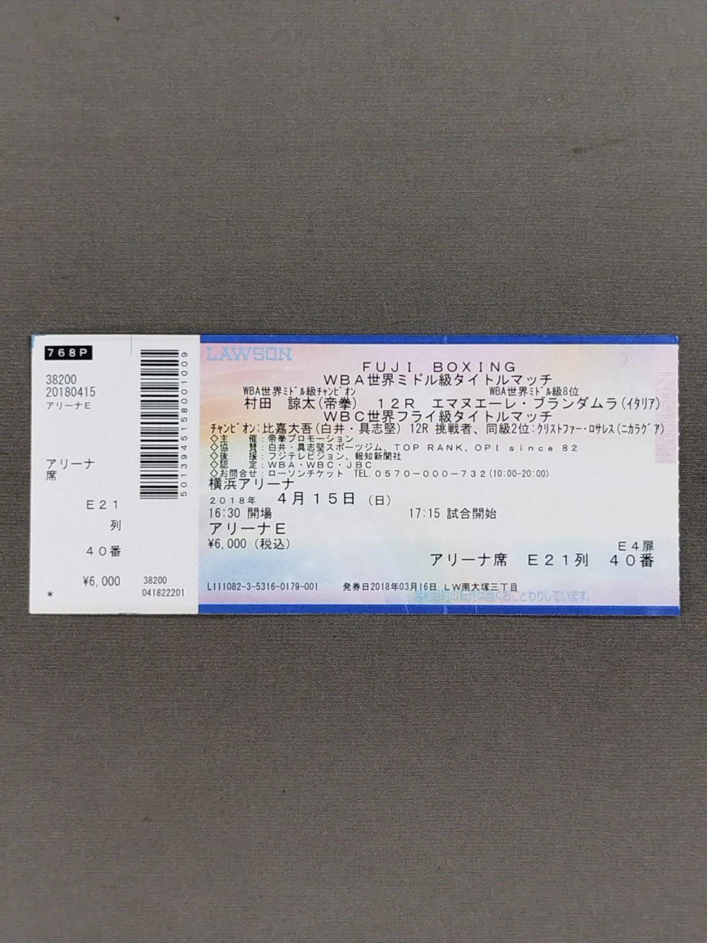 アリーナE E4扉E21列40番 /【WBA世界ミドル級タイトルマッチ】村田諒太vsエマヌエーレ・ブランダムラ /【WBA世界フライ級タイトルマッチ】比嘉大吾vsクリストファー・ロサレス