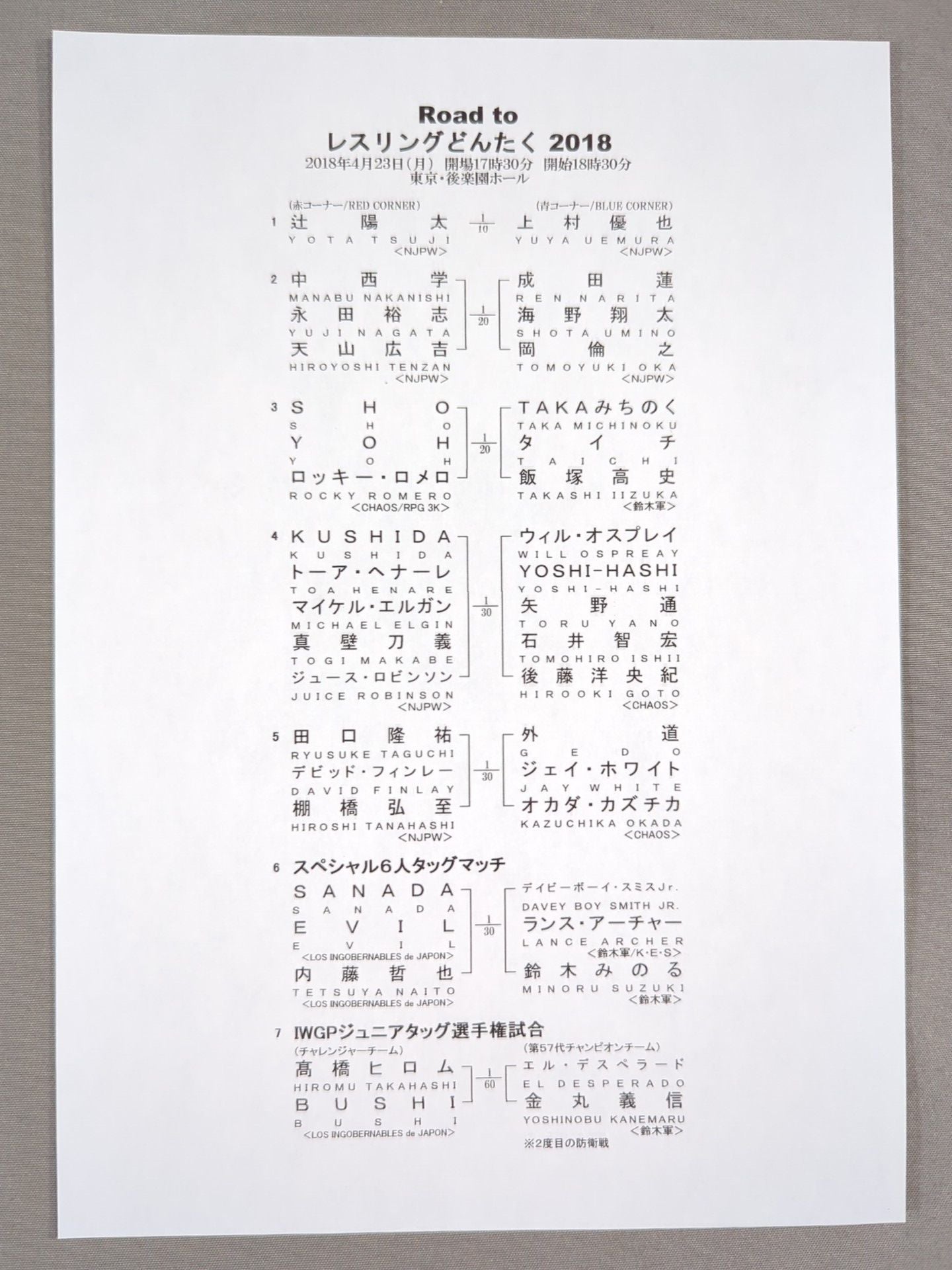 会場:後楽園ホール / 別紙対戦カードあり:【IWGPジュニアタッグ選手権試合】高橋ヒロム&BUSHIvsエル・デスペラード&金丸義信 Road to レスリングどんたく2018