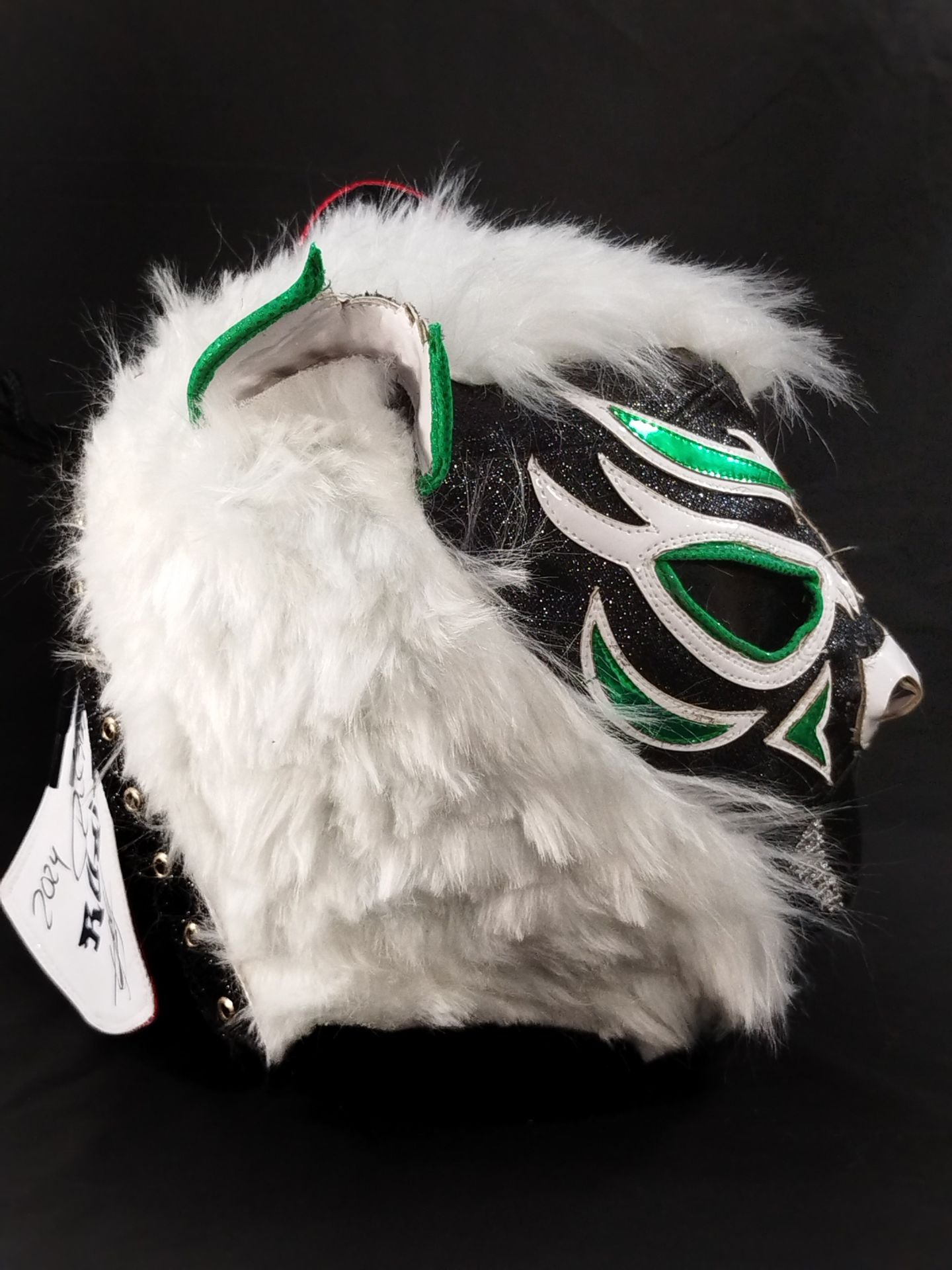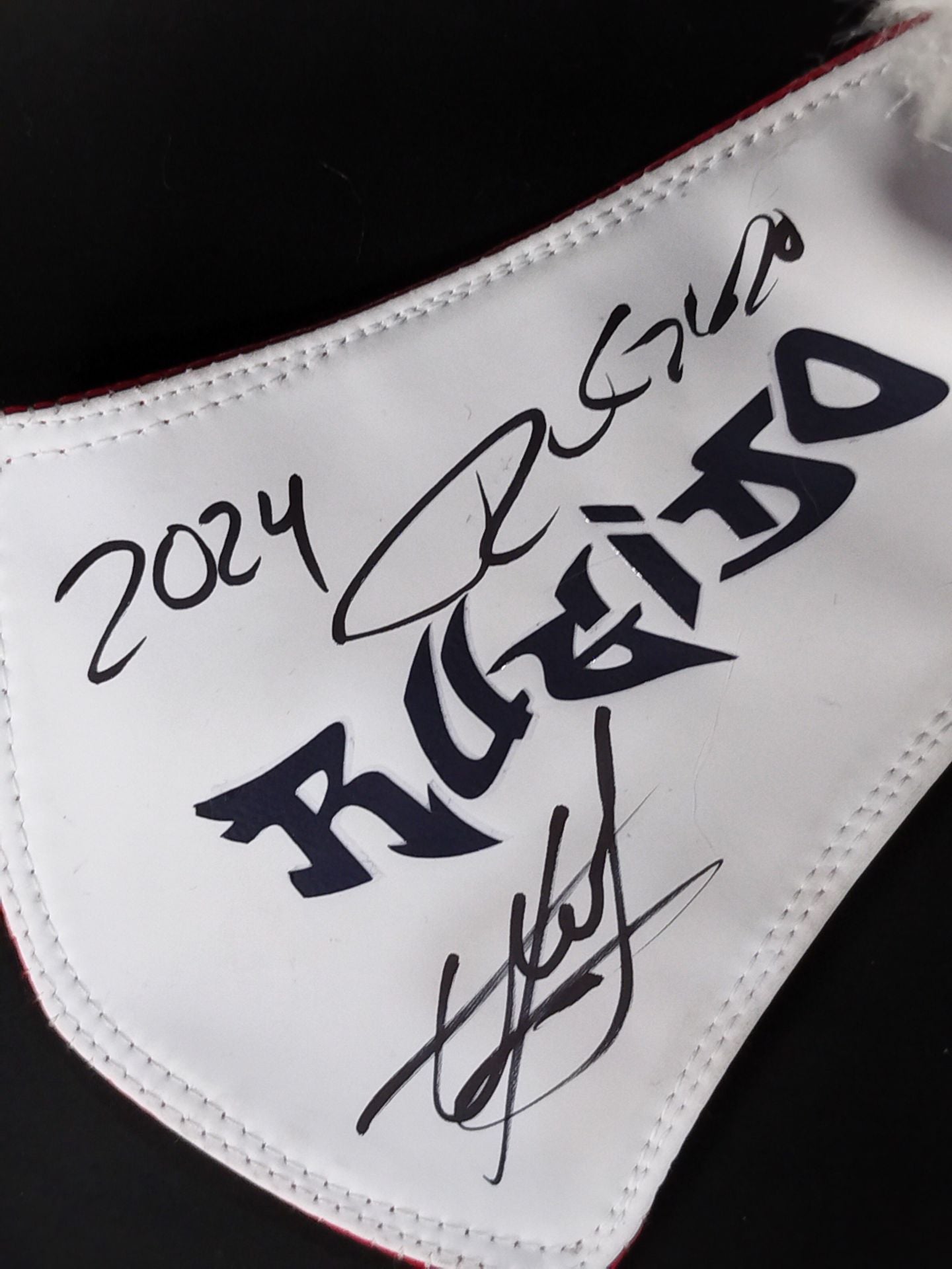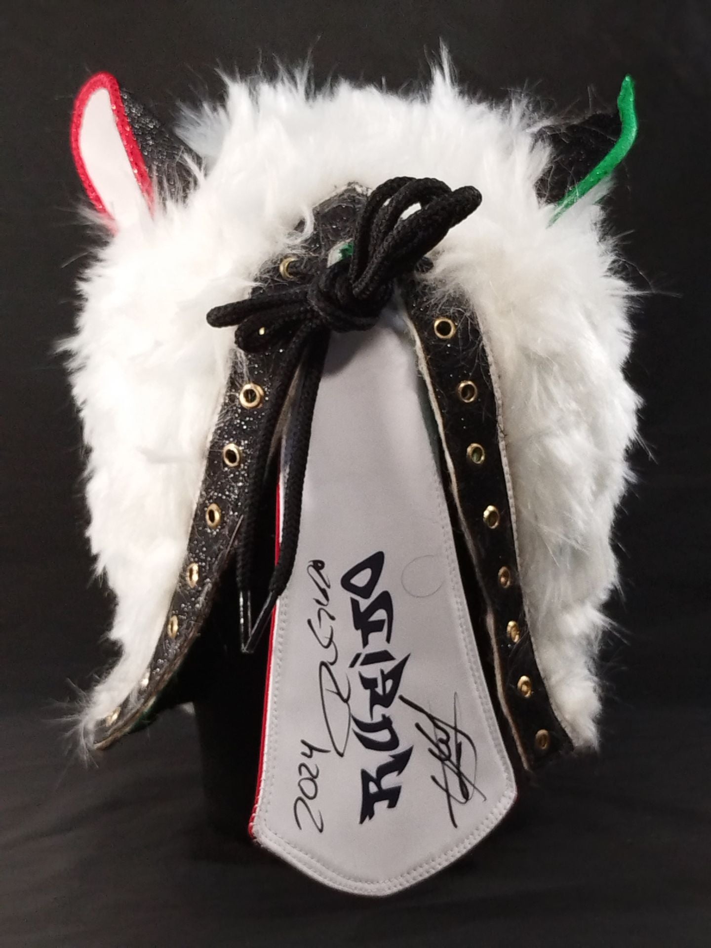 本人使用サイン入り 着用写真付 黒ラメ2重生地 白地緑特殊フチ&赤特殊フチ&銀特殊フチ 2024年にメキシコでの試合で使用していたもの