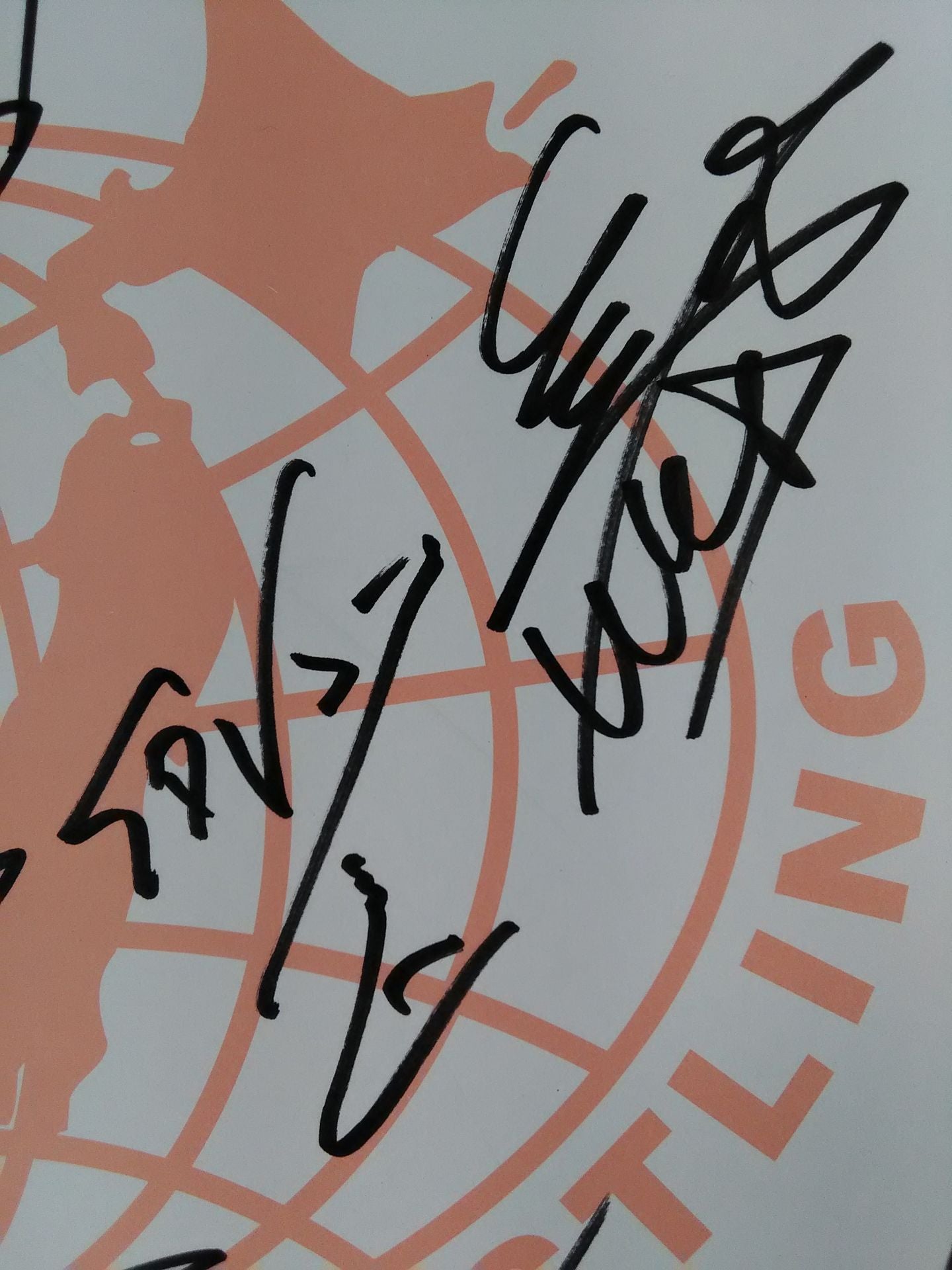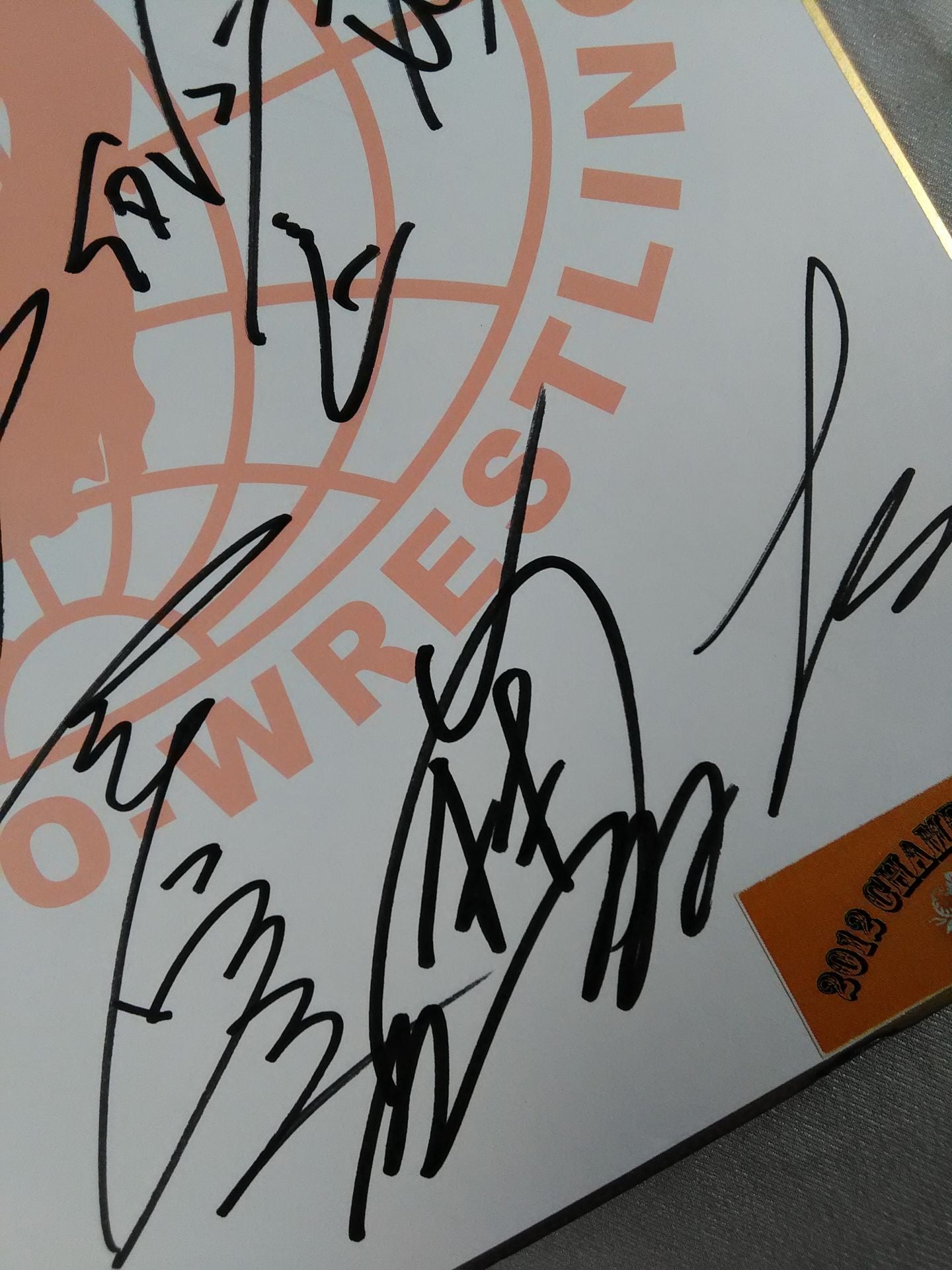 河野真幸、大森隆男、諏訪魔、太陽ケア、曙、KENSO、永田裕志、真田聖也、征矢学、関本大介、浜亮太、吉江豊、岡林裕二、征矢匠、全14選手のサイン寄せ書き!