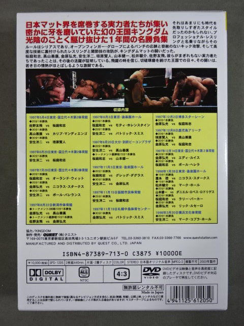 幻の王国キングダム 1年間の名勝負集 / 日本マット界を席巻する実力者達が集い、密かに牙を研いていた幻の王国キングダム。光陰のごとく駆け抜けた1年間の名勝負集!!安生洋二vsマーク・コブラ・ホール などを収録!!