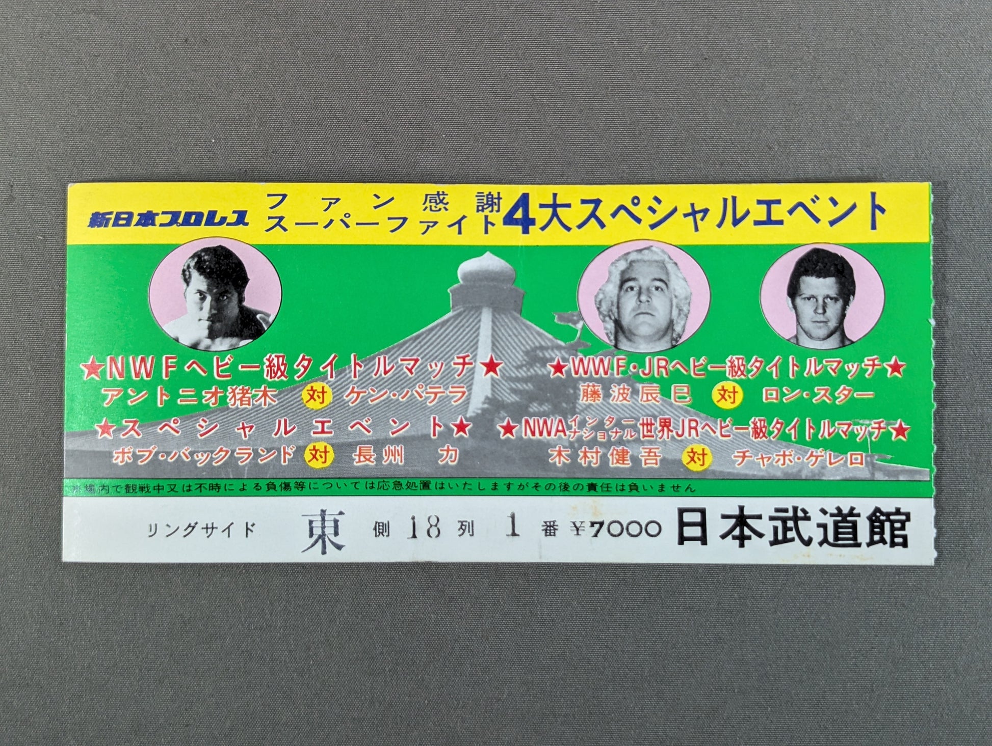 リングサイド 東側18列1番 / 【NWF選手権試合】アントニオ猪木vsケン・パテラ / 【WWFジュニア選手権試合】藤波辰巳vsロン・スター / 【NWAインタ世界ジュニア選手権試合】木村健吾vsチャボ・ゲレロ / 【スペシャルエベント】ボブ・バックランドvs長州力