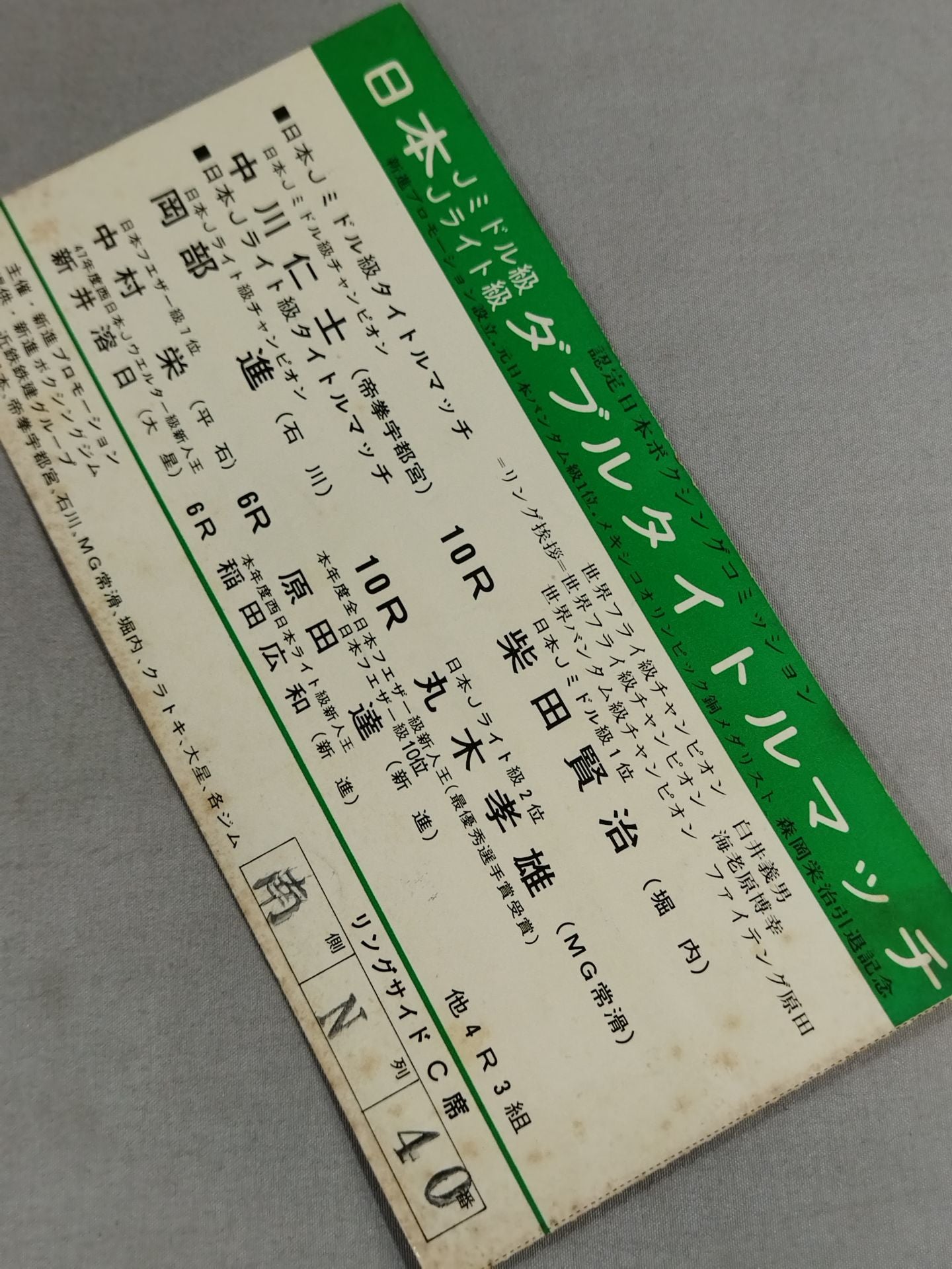 1974年 ★日本Jミドル級&Jライト級ダブルタイトルマッチ★ リングサイドC席 南側N列40番 / 【日本Jミドル級タイトルマッチ】中山仁士vs柴田賢治 / 【日本Jライト級タイトルマッチ】岡部進vs丸木孝雄