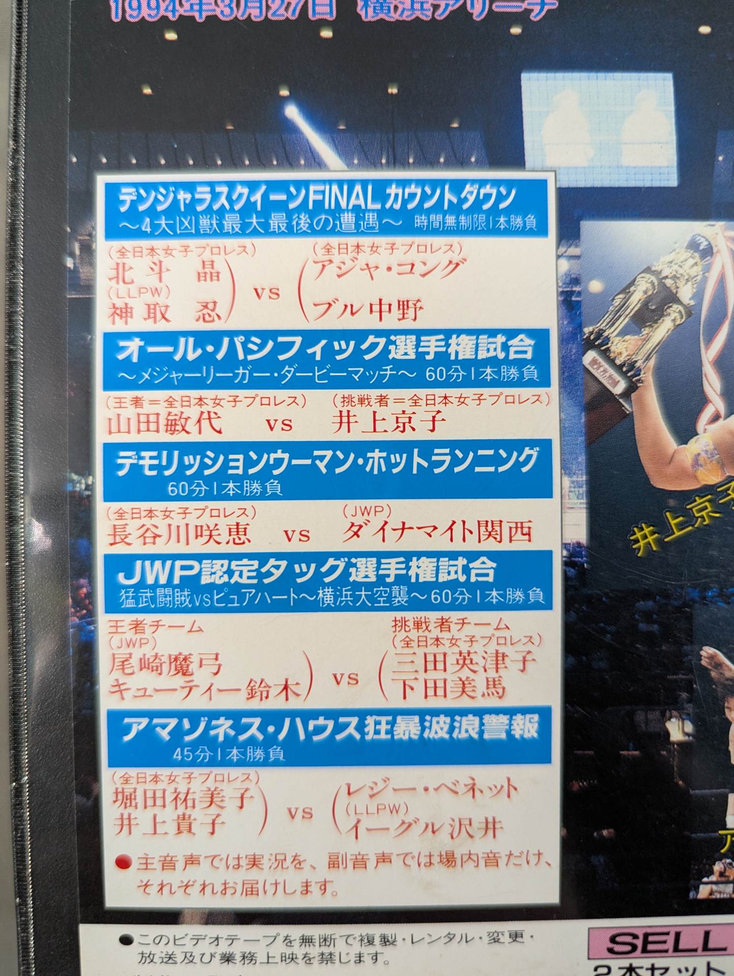 横浜アリーナが再び、女子プロレスの巨大夢空間と化した。 全女、JWP、LLPW、FMW・・・。充電されたエネルギーを大放出! デンジャラスクイーン北斗晶が神取忍と夢の初タッグ、4大凶獣決戦でカウントダウン 緒戦を激勝!! 全11試合ノーカット収録